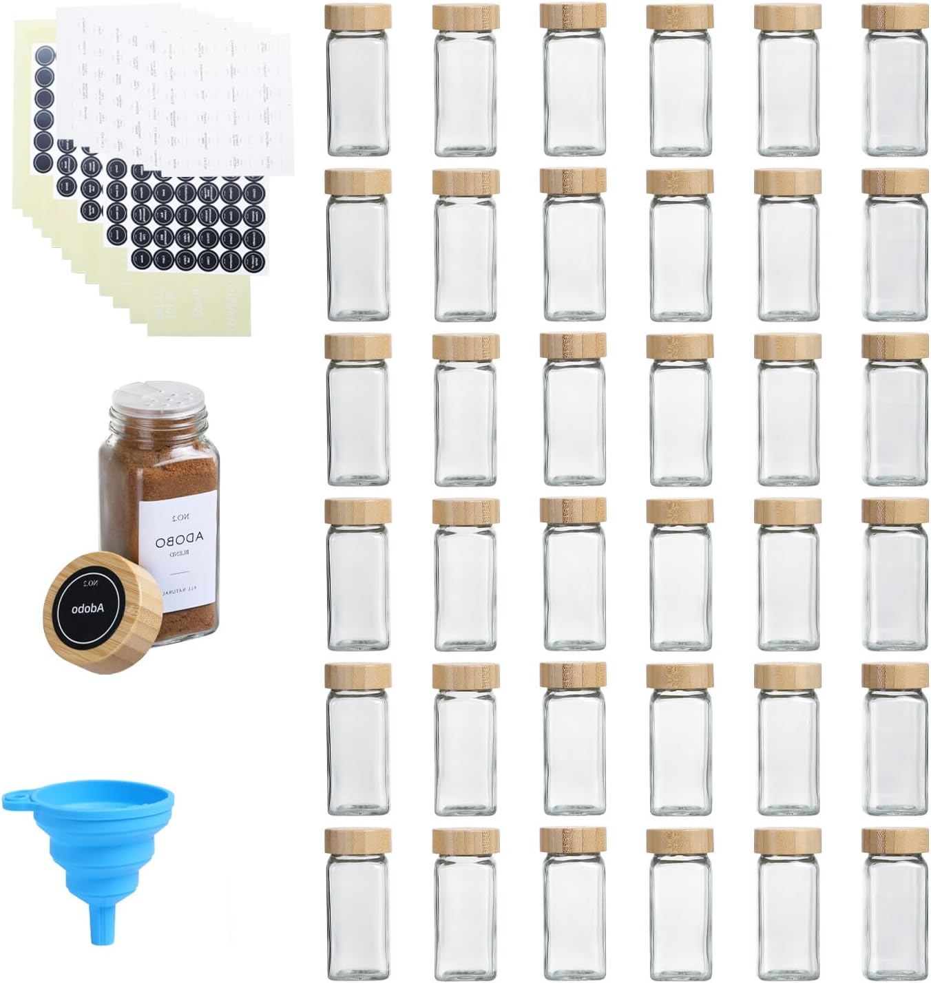 4 oz Glass Spice Jars with Bamboo Lids, Clear Empty Jars with Labels Stickers, Collapsible Funnel, Seasoning Storage Bottles for Spice Racks (36 Pack)