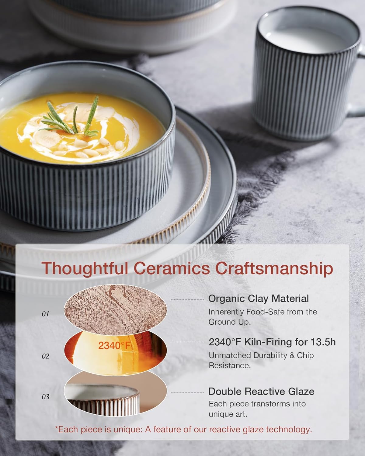 - [Premium Ceramic Durability]: Fired at 2340°F for 13.5 hours, our dishes boast impressive weight and thickness. They can resist chipping, scratching and daily wear, ensuring reliable kitchen use. Enjoy worry-free daily use, even with silverware