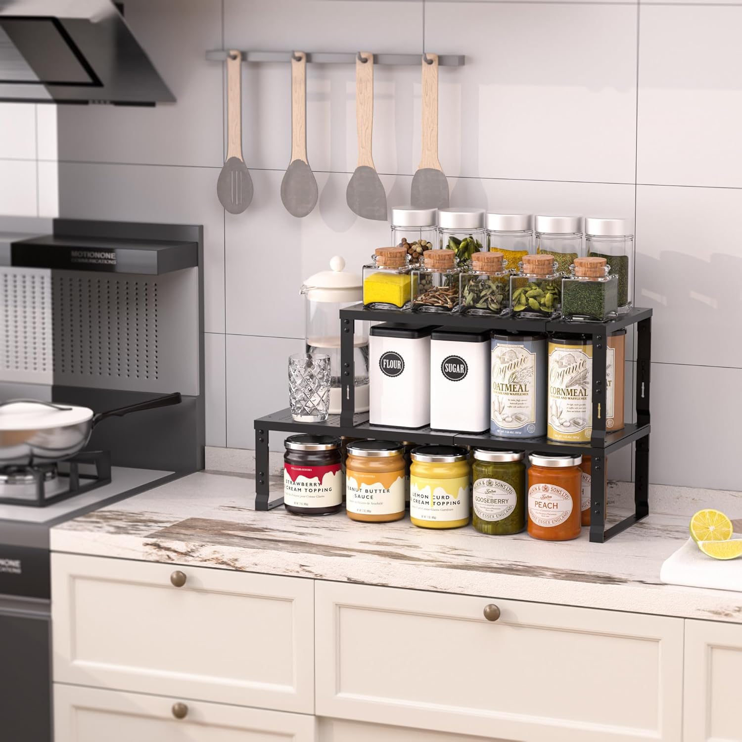 - 🥫 【Adjustable for All Shapes & Sizes】 "Four height settings accommodate tall spice bottles, deep dishes, or bulky jars. The modular design ensures secure storage for uneven items – no more tipping or cluttered counters!"
