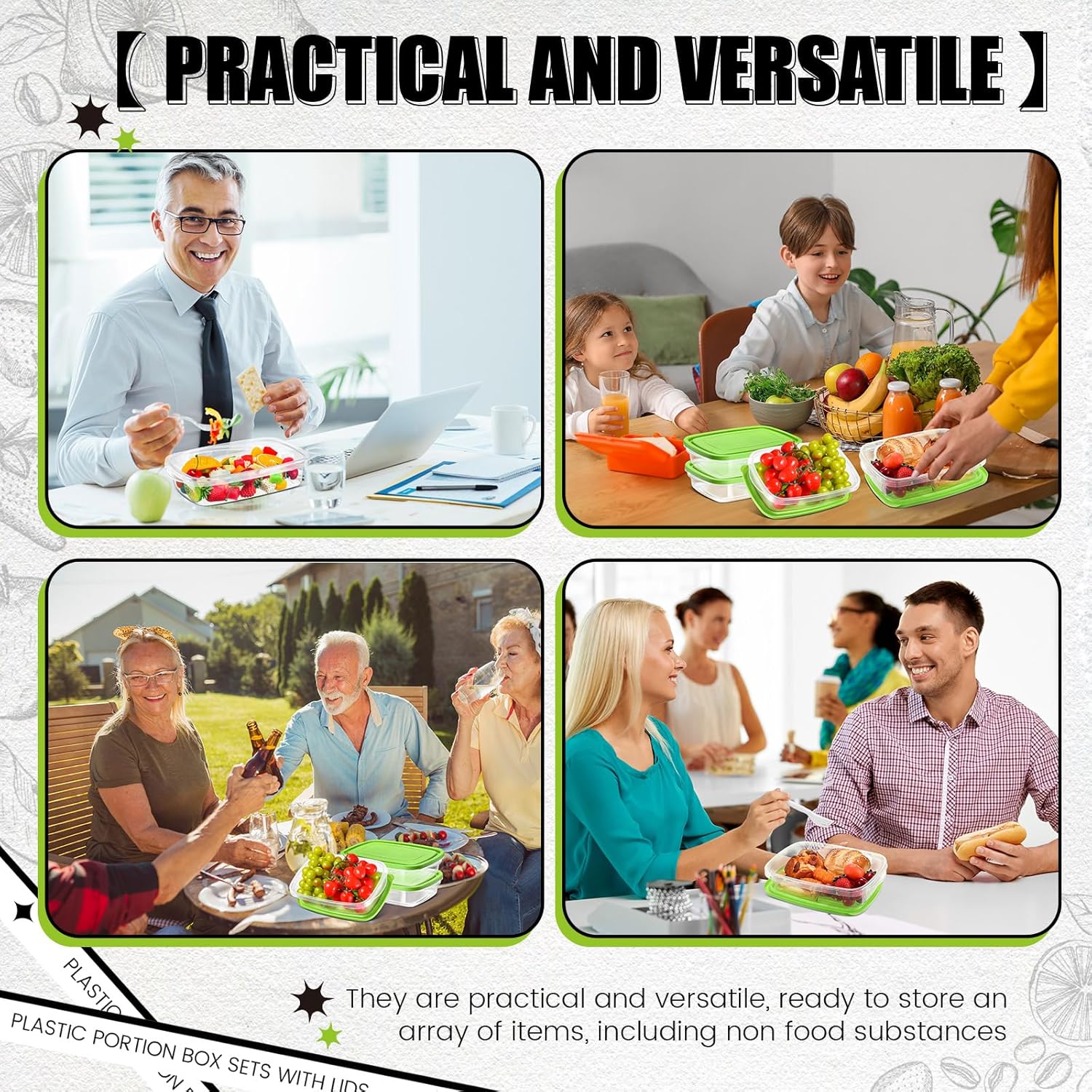 - Stackable Design: these plastic portion box with lids boast a stackable design that saves space in your fridge, freezer or pantry; Organize your meals or ingredients efficiently, enabling you to find exactly what you're looking for, exactly when you need it