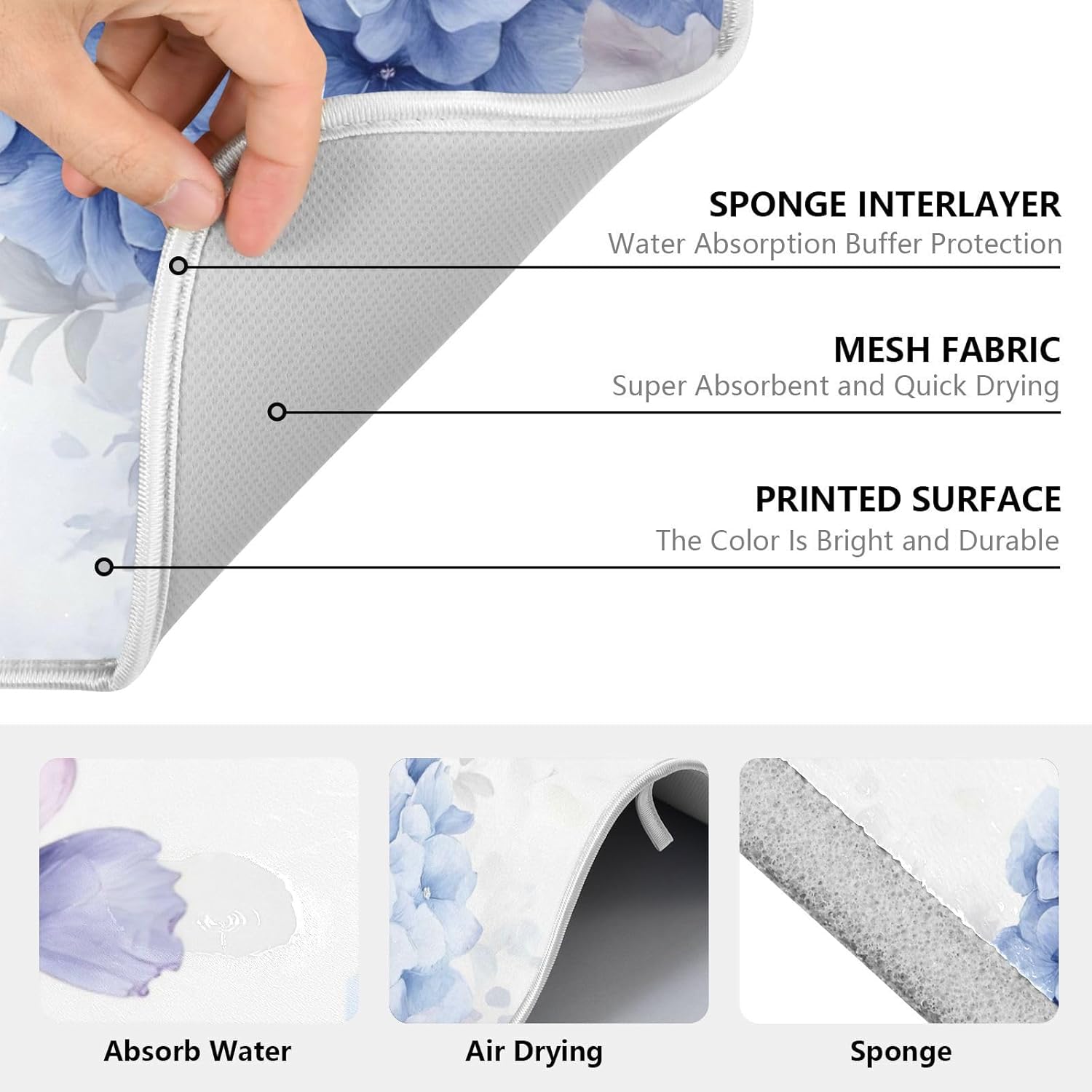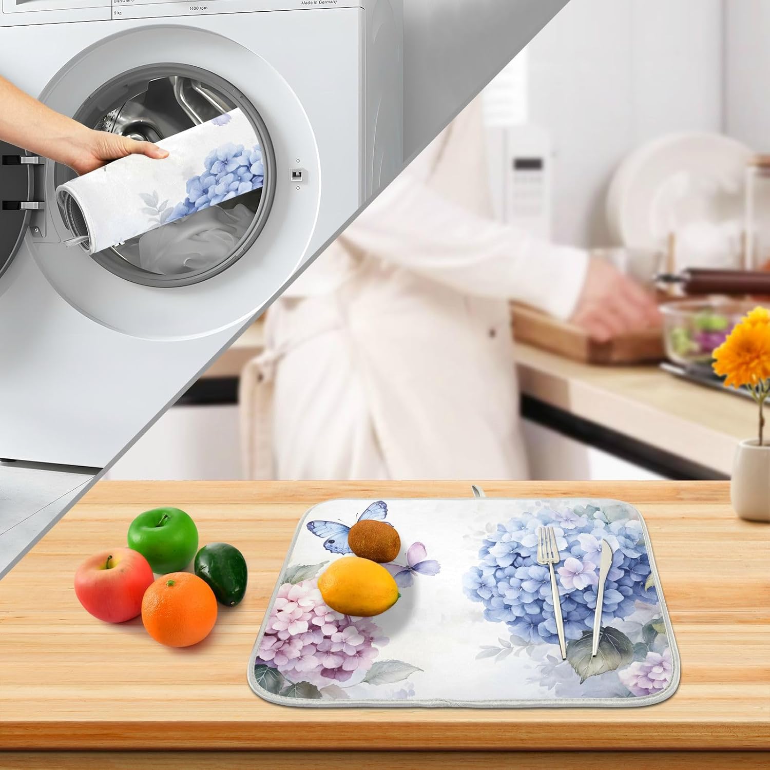 - Exquisite workmanship: This dish drying mat with durable and neatly sewing around the edge helps contain spills, the stitches don't fall off so that they are reversible for convenience and optimal performance, but one-sided printing, matchs delicate dishes and stemware, bring decorations to your home or kitchen, keeping tables clean, the soft and foldable material is easy to store, this dry pad has a lanyard design, which can be hung up when you are not in use and does not take up space