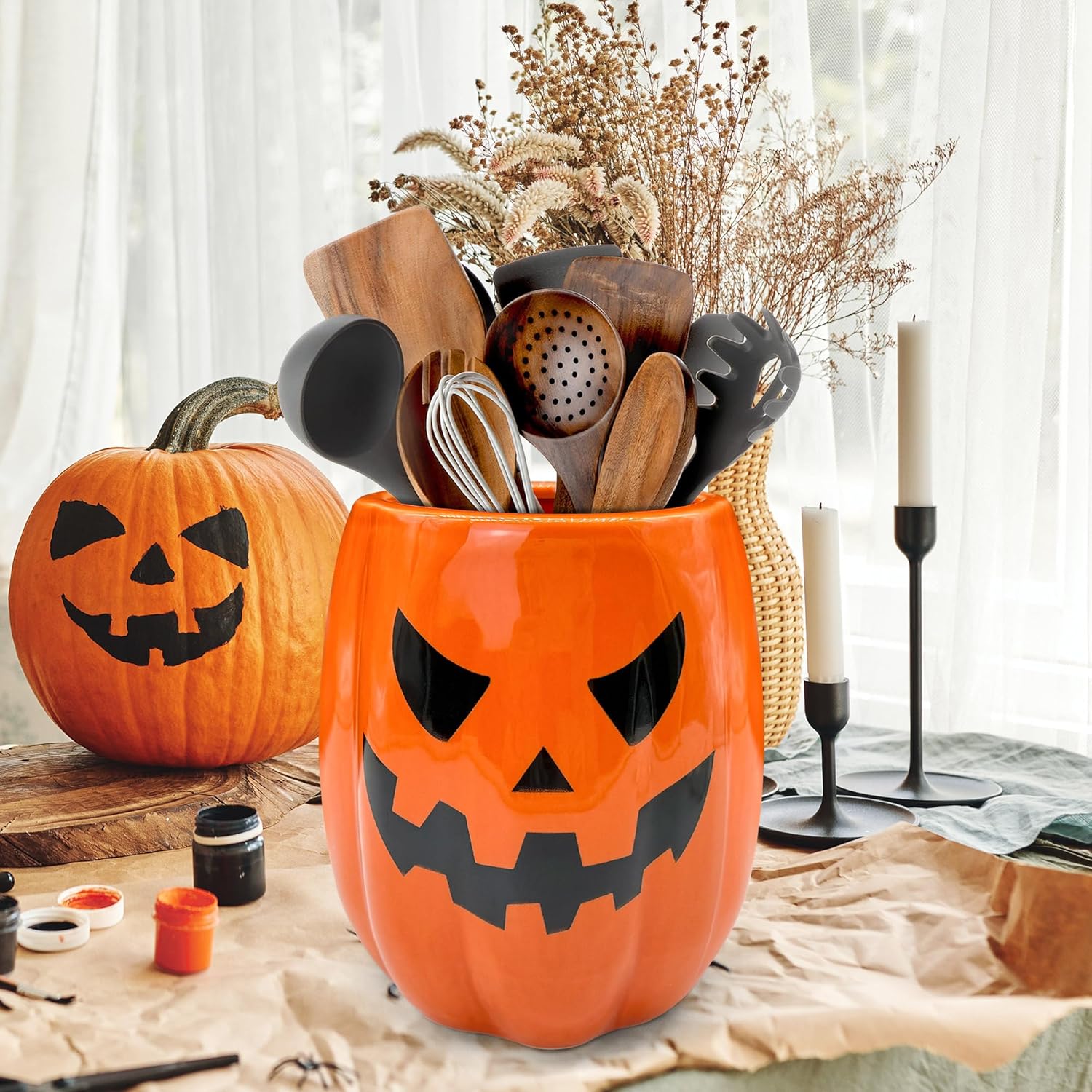 - HALLOWEEN KITCHEN DECOR: This Halloween-themed pumpkin-shaped utensil holder features iconic holiday elements—playfully spooky and adorable. It adds a touch of festive magic to your kitchen. Whether it's for everyday use or a Halloween holiday party, it will be the center of attention and have your guests raving about it