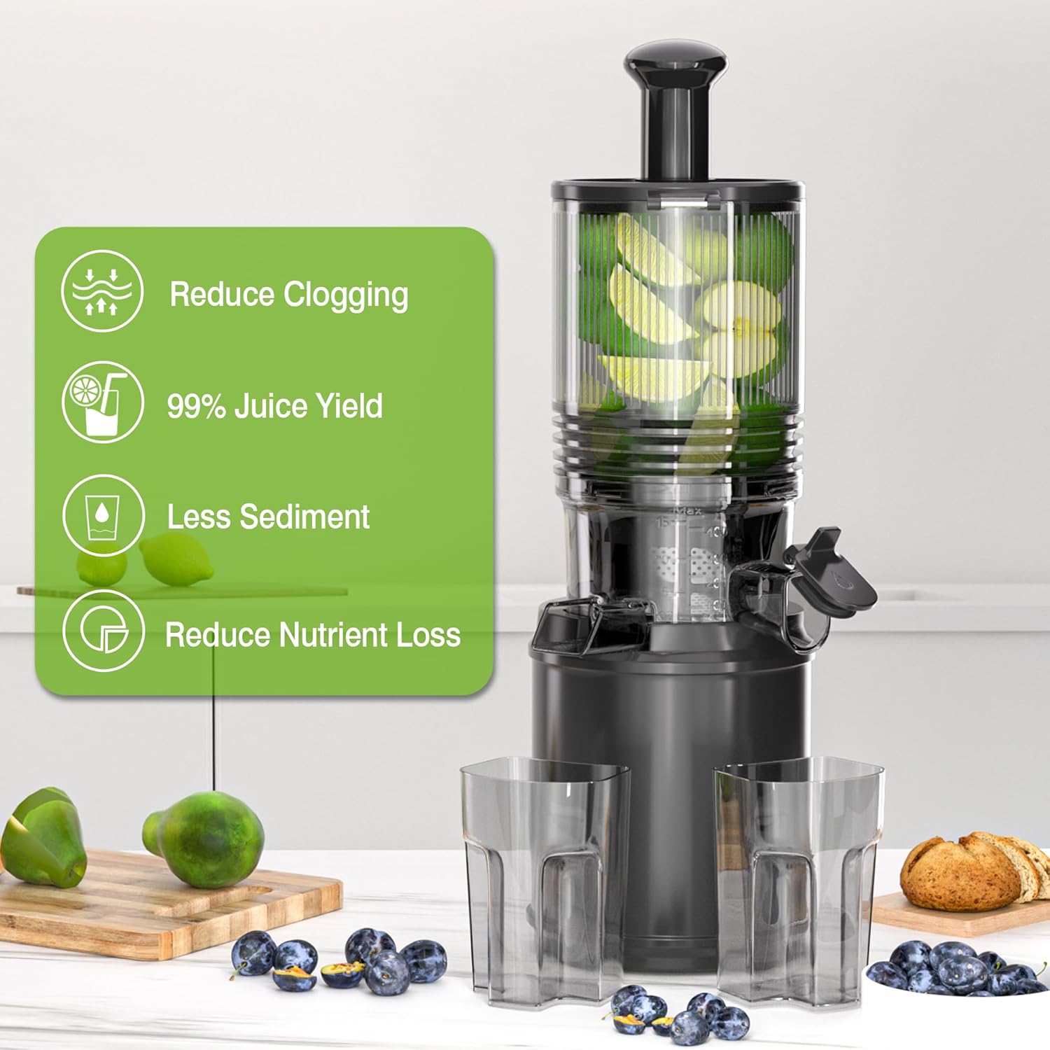Cold Press Juicer – Hands-Free Electric Masticating Juicer Machine with 6.5" Large Feed Chute, 350W Masticating Juicer Machine For More Juice, Less Pulp, High Juice Yield – Easy Cleanup & Assembly