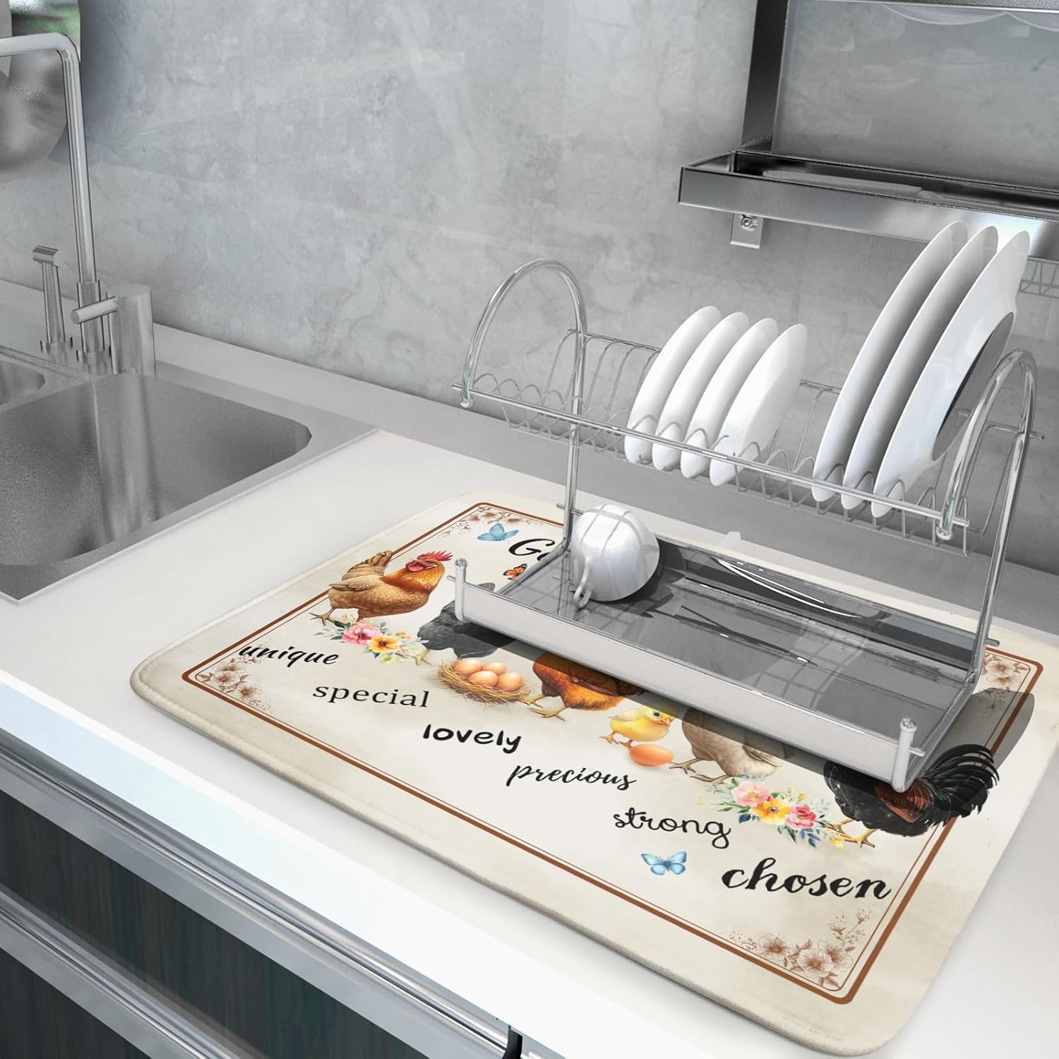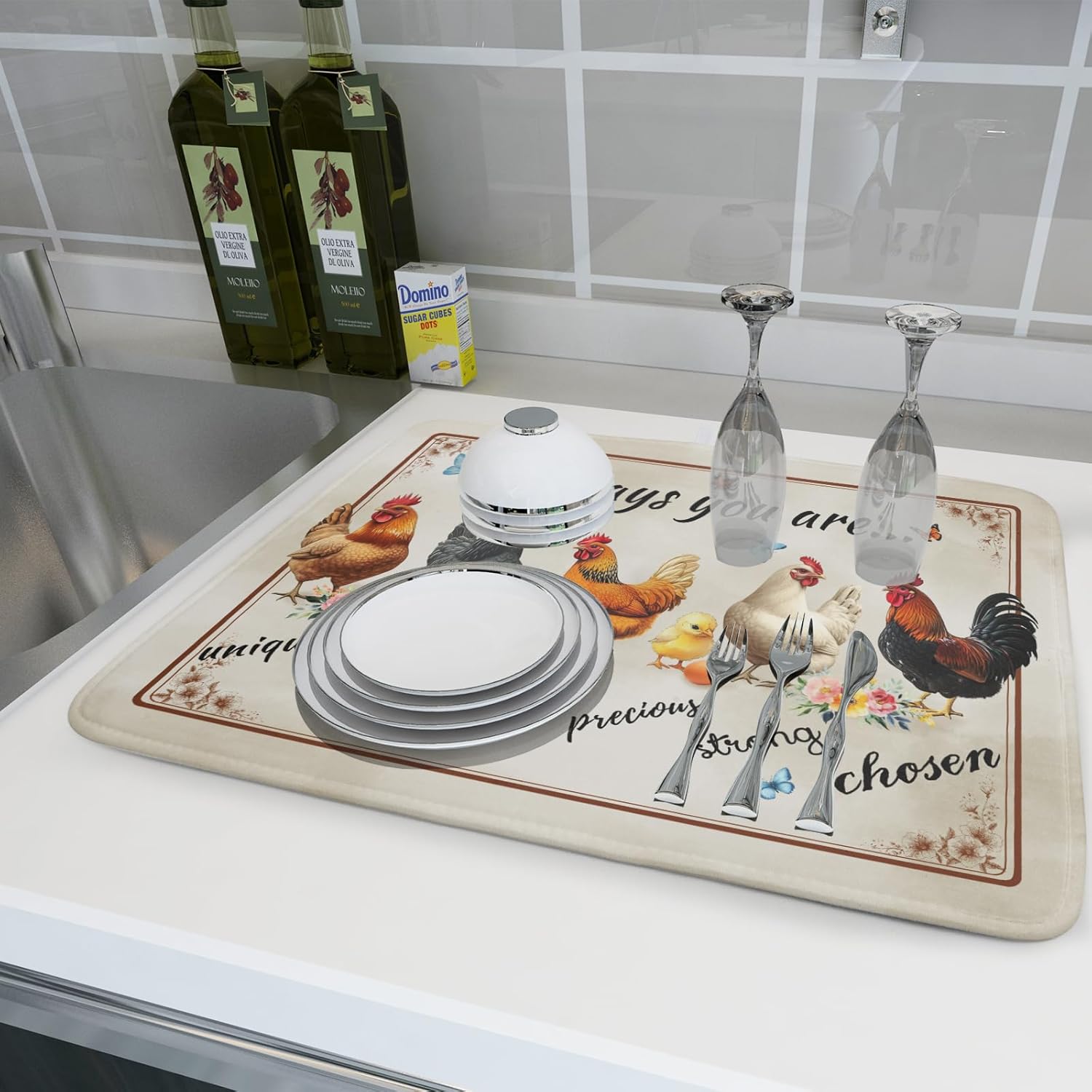 Farmhouse Rooster Dish Drying Mat - Vintage Chicken Absorbent Microfiber Dish Drying Pad for Kitchen Coffee Bar