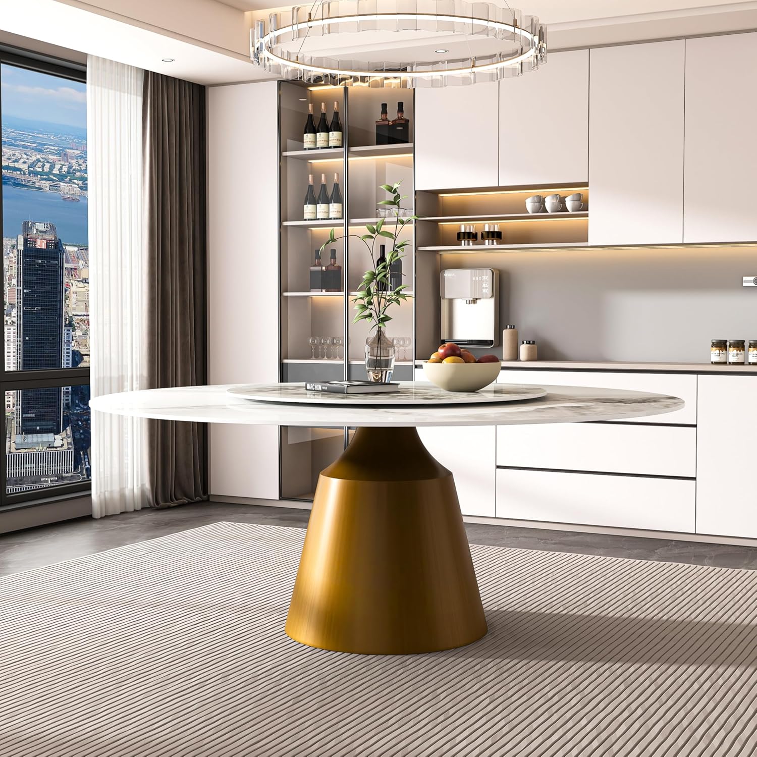 Montary 59" Modern Artificial Marble Round Dining Table with Bronzed Stainless Steel Cone Base & 31.5" White Sintered Stone Turntable, Dining Room Table with Lazy Susan for 6-8 (Only Table)