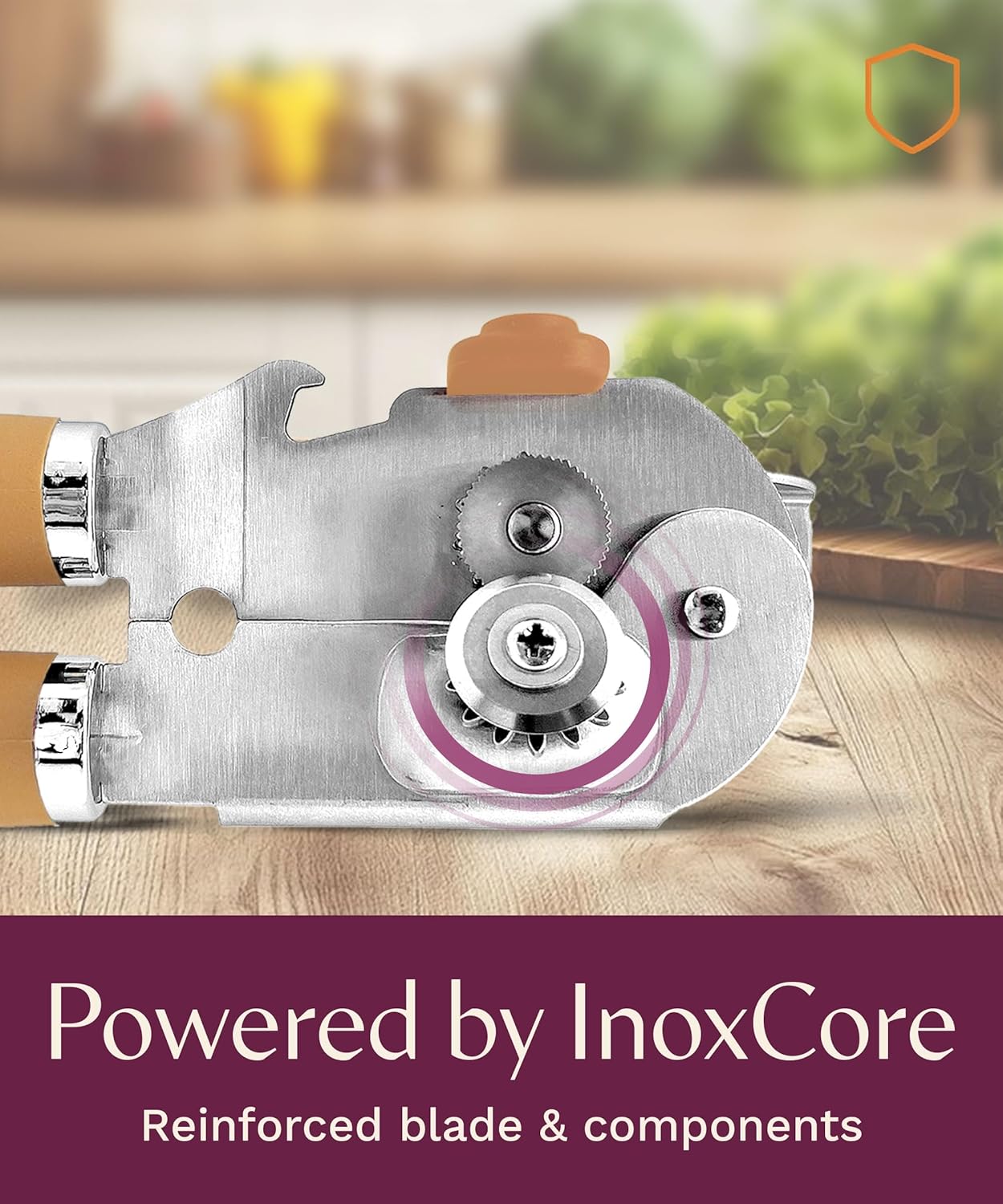 - 【INOXCORE Rust-Proof Stainless Steel Can Opener & Precision Gears with Ultra-Sharp Blade】 Constructed with reinforced INOXCORE stainless steel components, rust-proof finish, and precision-aligned gears, this premium kitchen tool houses a razor-sharp, high-carbon blade for clean, jag-free cuts every time. Its solid weight and brushed exterior delivers lasting sharpness and a premium feel.