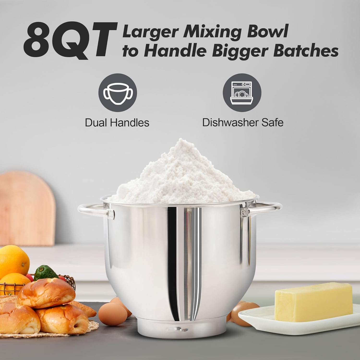 - 8QT Large Capacity Bowl With Handles - 8QT Stainless steel bowl can meet all your kitchen needs. The Stand Mixer is easy to use for making cakes, breads, cookies, pastry, muffins and waffle, and the dual handles are more convenient to hold.