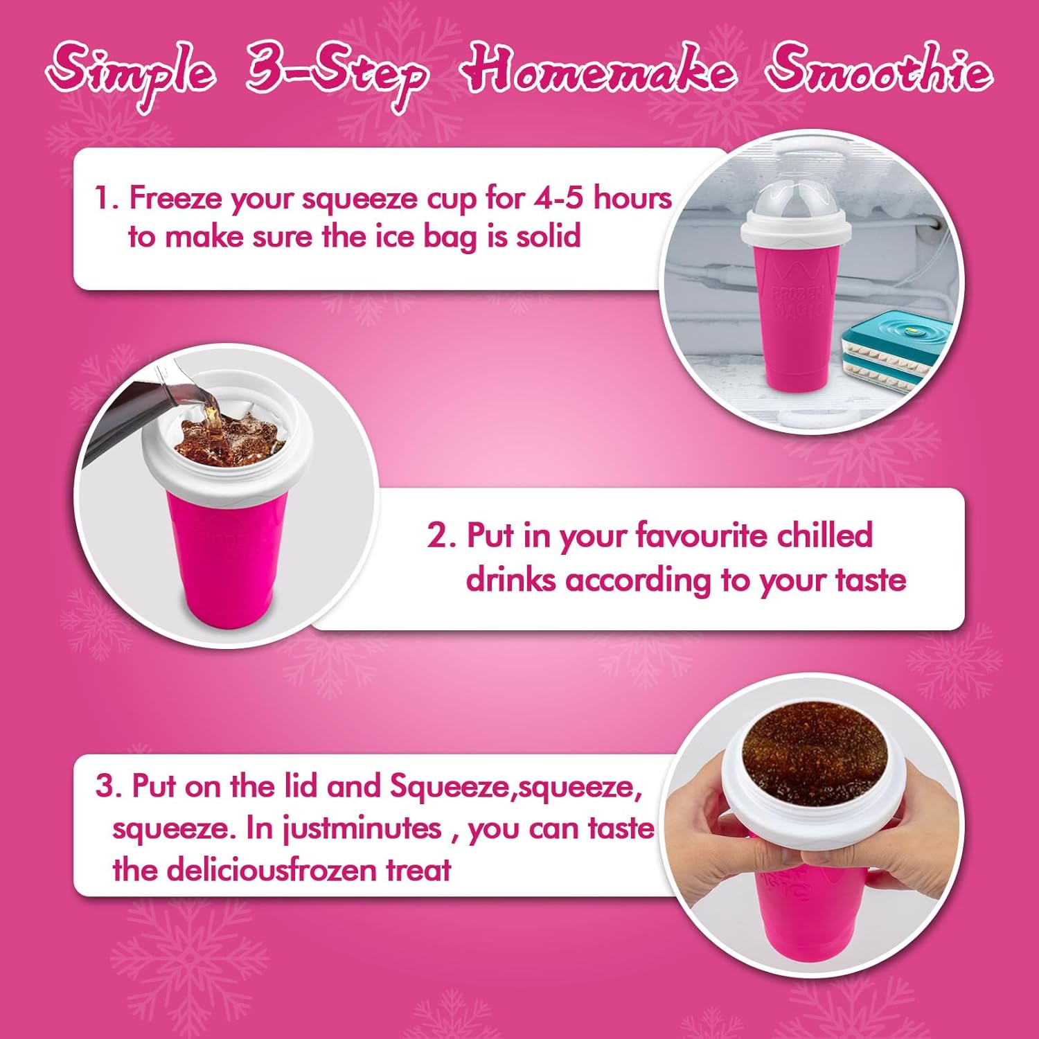- 【Immersive feel the joy of DIY】The Frozen Magic Cup is very easy to use. First, freeze the smoothie cup 5-6 hours in advance; then pour the prepared milk, juice, soda, beverage, etc. into the smoothie cup and cover it; then just squeeze the cup with your fingers for 1-2 minutes until you see a smoothie shape. Bring you and your family the coolest summer food in the shortest time