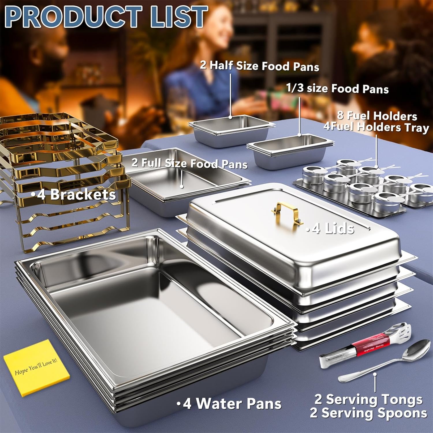 SIOTMERA 9QT Chafing Dishes for Buffet 4 Pack, Multiple Food Pans Thickened Stable Stainless Steel Chafing Dish Buffet Set, Rolled Edge Design Food Warmers for Party Catering Weddings, Gold and Silver
