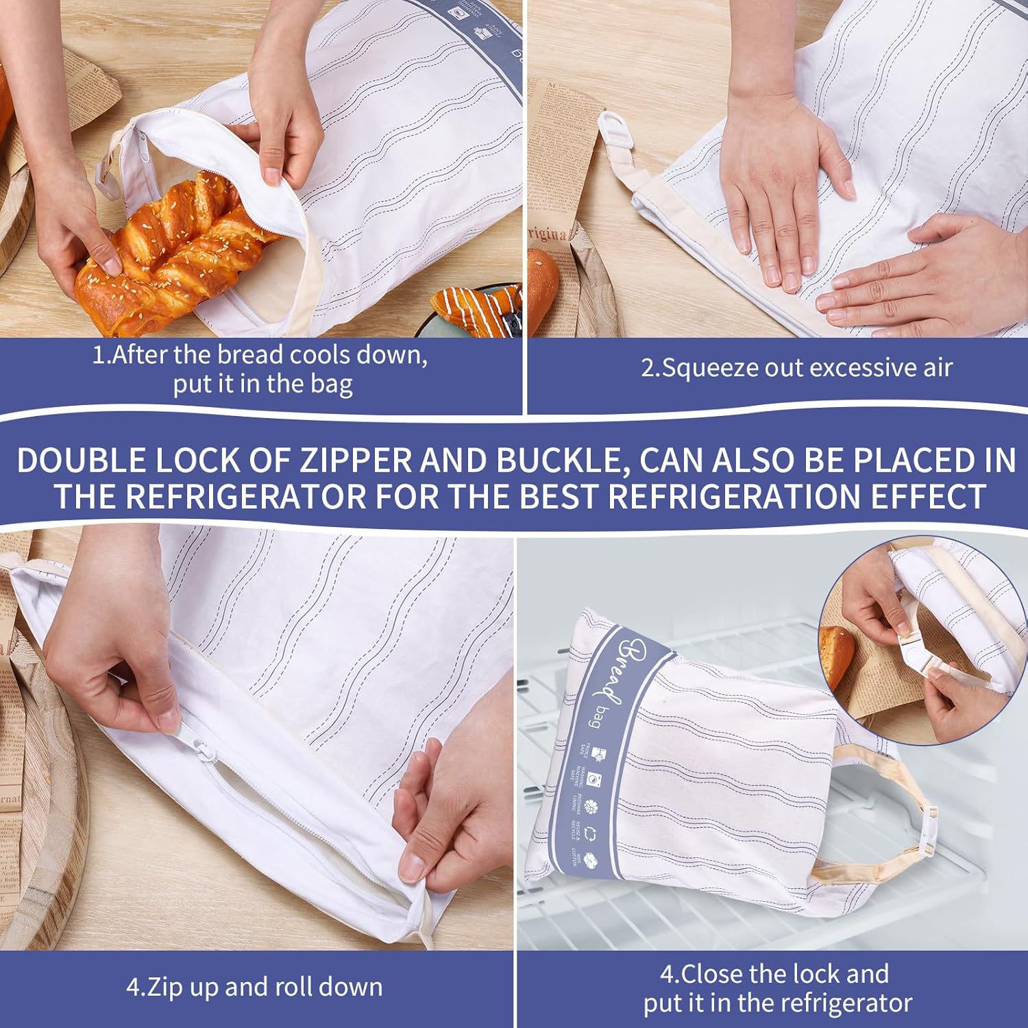 - 【Freezer Bread Bags】Our beeswax bread bags are made of reusable fabrics and can be directly put into the freezer for frozen storage. They have zippers and roll locks, and the unique design is conducive to maintaining freshness for a long time.
