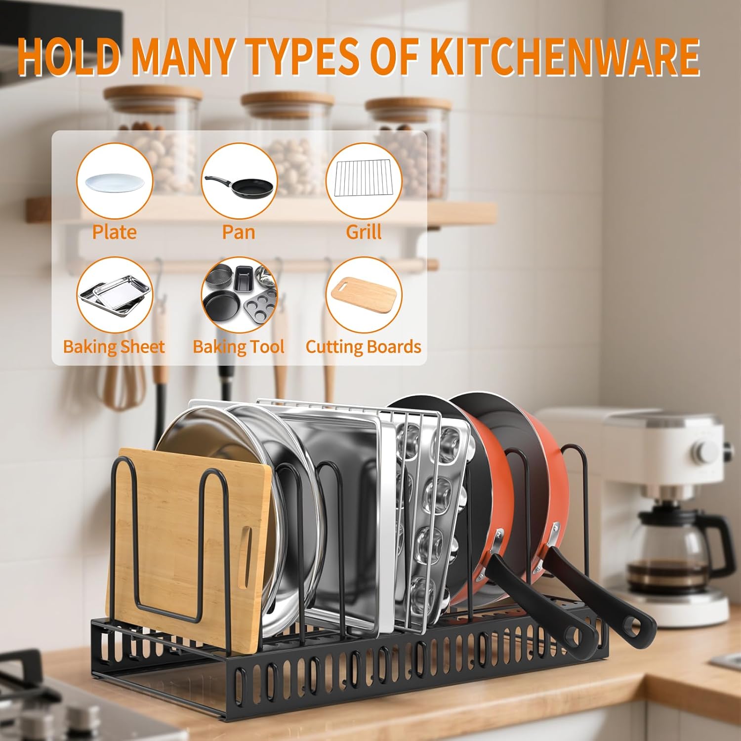 - 7 Adjustable Dividers: The pot organizer's dividers can be adjusted according to the thickness of the pot. perfect for pan, pot, gray, plate, cutting board, bakeware, etc