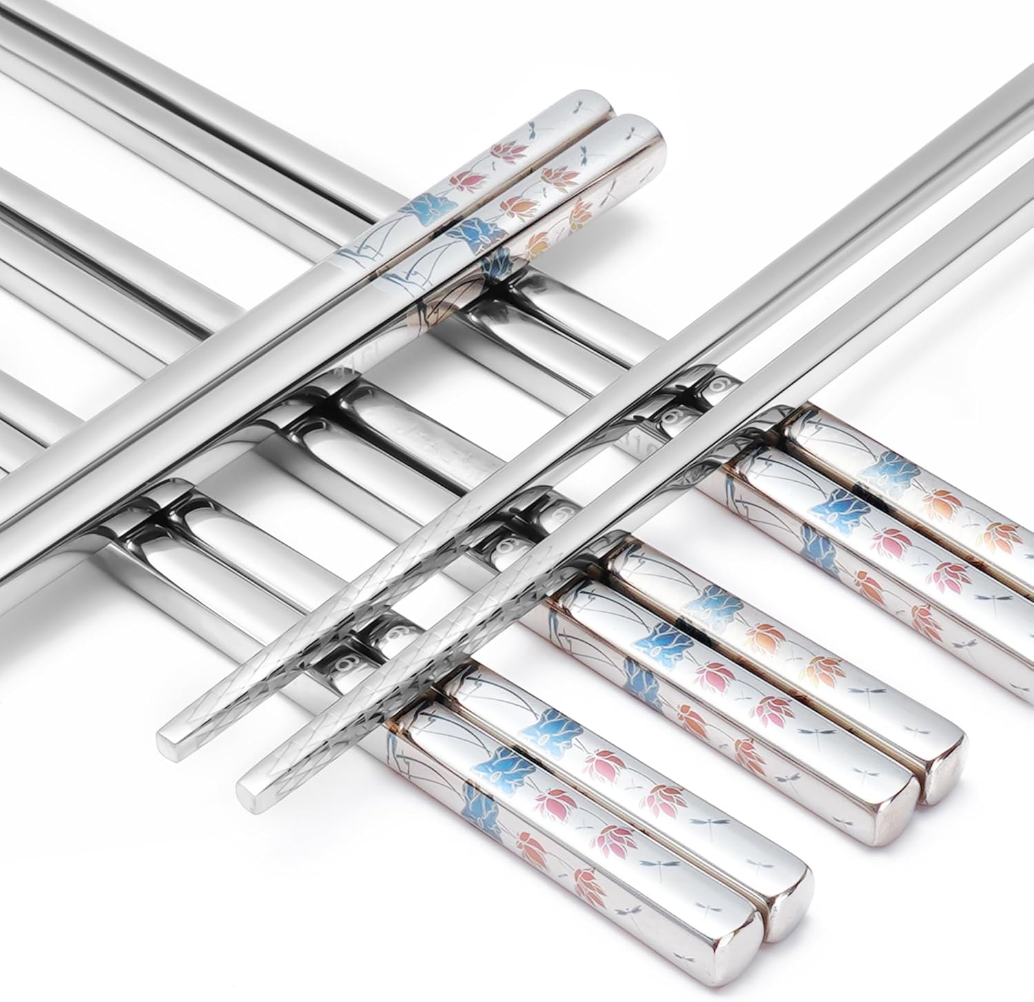 - Multi-color laser engraved patterns: Colored patterns are much more beautiful than monochrome patterns, and the metal chopsticks use permanent laser engraved patterns. The color will not fade after long time use. Each pair of stainless steel chopsticks has a different style. Each family member can have their own reusable chopsticks without worrying about mixing them. It is healthier and more hygienic.