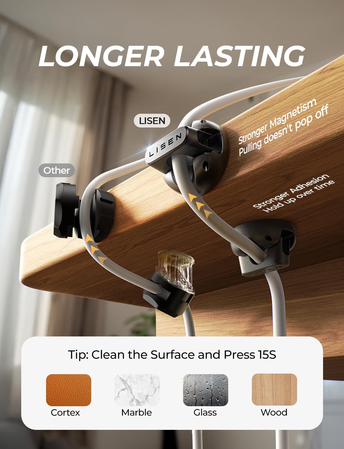 - No-Residue, High-Strength Adhesive: LISEN cord organizer for desk uses premium acrylic adhesive, stronger than 3M tape and leaves no residue. With 4 extra adhesive pads, magnetic clips has strong adhesion and flexible installation. Wire organizers for cords can firmly stick to smooth and dry surfaces like wood, glass and ceramic tiles. The transparent pads won't damage furniture, suitable for home and office. Easily manage and tidy up cords, improving space neatness and functionality