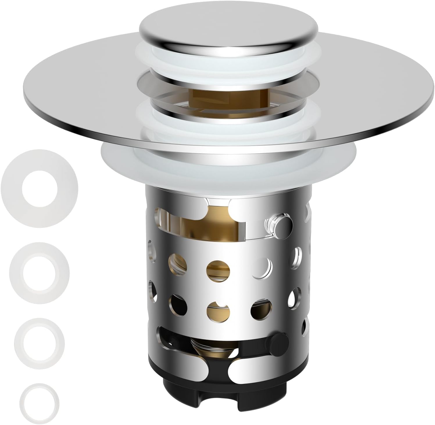 Universal Bathroom Sink Stopper Hair Catcher Upgraded with 2-Layer Detachable Filter Basket – 4 in 1 Pop Up Sink Drain Strainer, Anti-Clog, Odor-Block, Universal Fit for 1.1''~2.36'' Sinks, Chrome