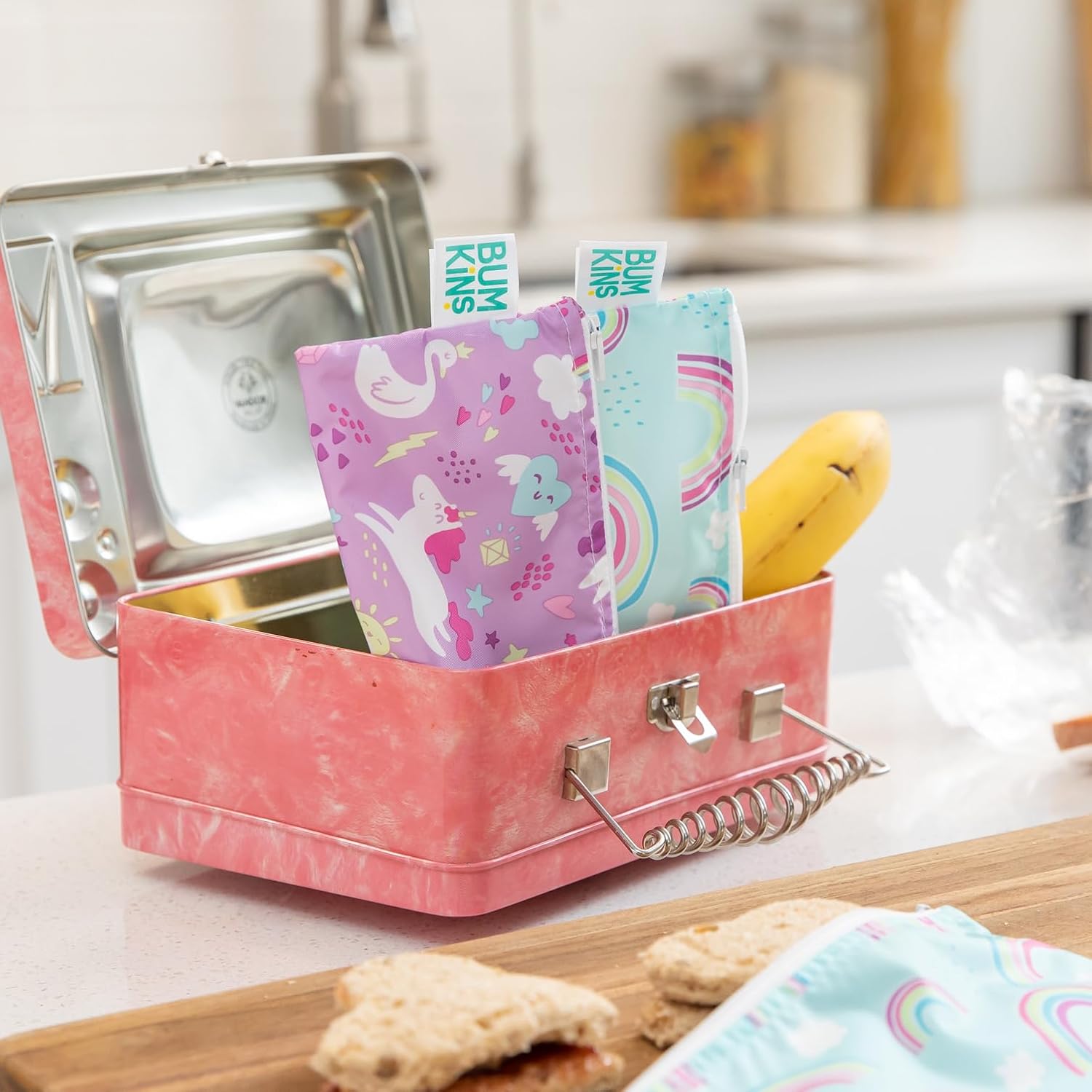 Bumkins - Cloth Snack & Sandwich Bags - For Storage, Travel, Food Prep, Lunch - Reusable, Water Resistant, Washable, Dishwasher Safe - Snack Bags for Kids - Zipper Closure -Unicorns & Rainbows -4 Pack