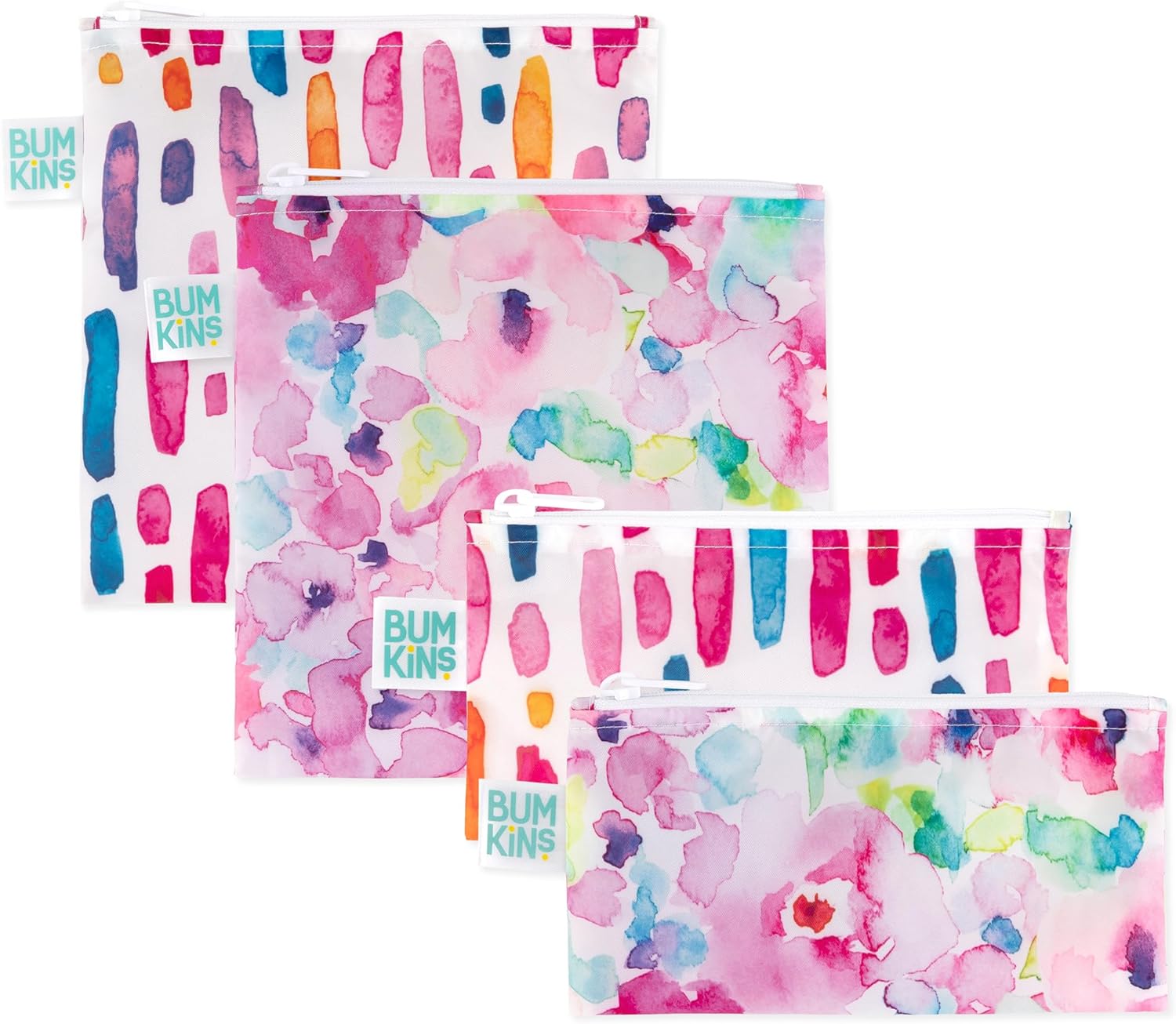Bumkins - Cloth Snack & Sandwich Bags - For Storage, Travel, Food Prep, Lunch - Reusable, Water Resistant, Dishwasher Safe - Snack Bags for Kids - Zipper Closure - Watercolors & Brushstrokes - 4 Pack