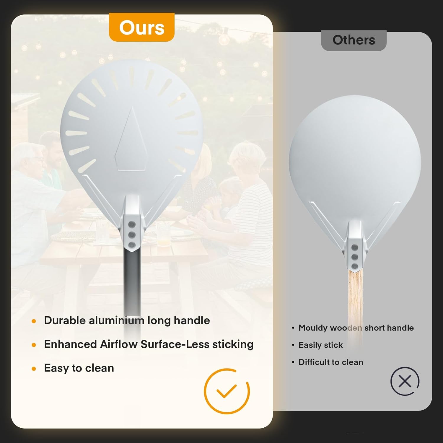 - High Quality Material: The pizza turning peel is made of aluminum alloy material, which can withstand higher temperatures. The pizza oven brush has a wooden handle for a comfortable grip that avoids heat transfer and overheating