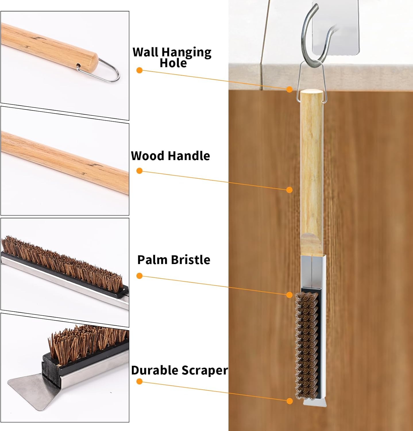 - Pizza Oven Brush with Scraper: Pizza oven cleaning brush features sturdy bristles, which allows efficient cleaning without scratching your pizza stone. And the built-in stainless steel scraper of the oven stone brush easily tackles stubborn baked