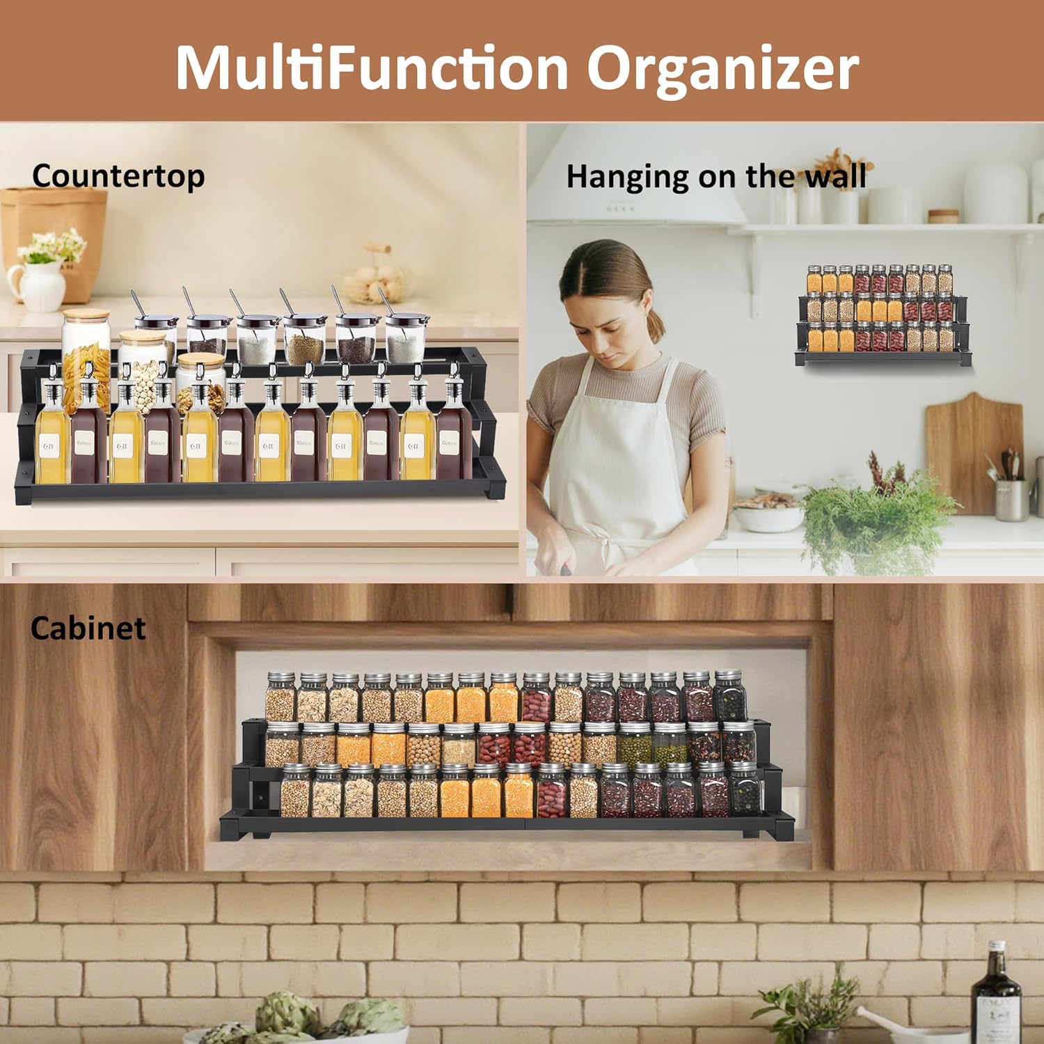 - 3-Tier Expandable Design: Expands in length from 16.1" to 29.5" to fit narrow cabinets and shelves—requires cabinet depth over 11" to fit properly. Holds 30+ spice jars or cans with tiered visibility, keeping your storage neat and accessible