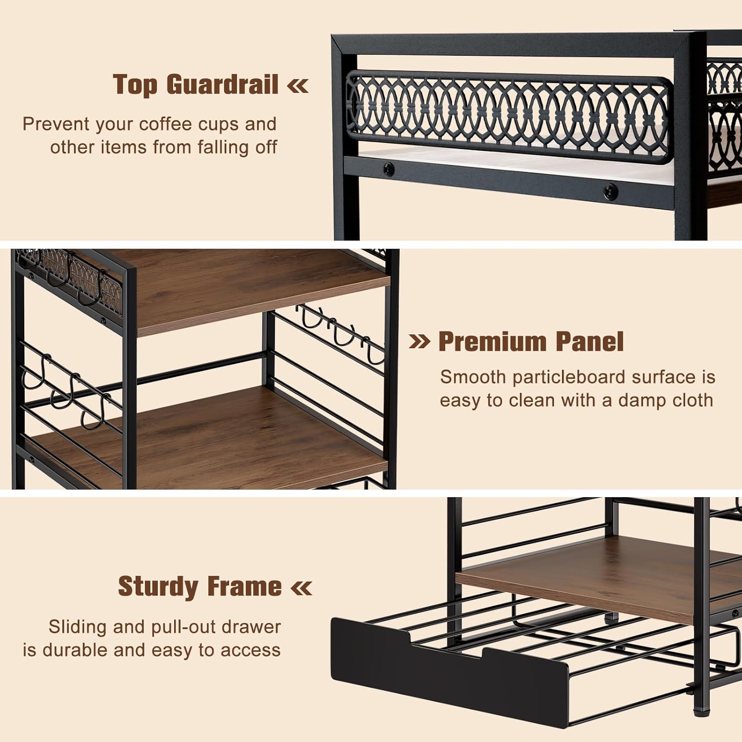 - 【3-Tier Larege Capacity】The top layer of coffee stand organizer is deaigned with three sides baffletop layer to prevent items from falling effectively. The display shelf on the second tier makes it easy to place all your coffee supplies, and the sliding drawer of the bottom can place 30 k-cup coffee capsules, maintaining easy access to your coffee needs