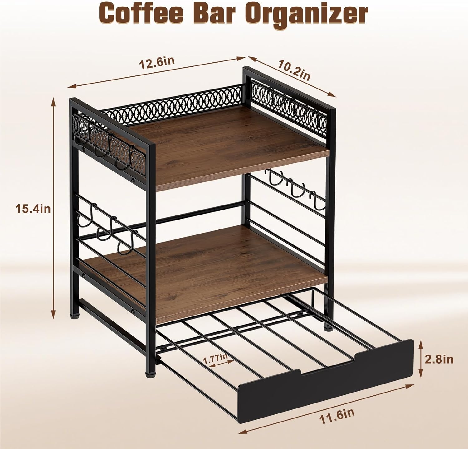 - 【Space-Saving Solution】This all-in-one coffee organizer for countertop combines combines mug holders, coffee bar organizers, and coffee pod drawer to help you maximize space, keeping everything neatly accessible. Suitable for smaller kitchens or coffee nooks, it is an great choice for limited spaces to storage coffee