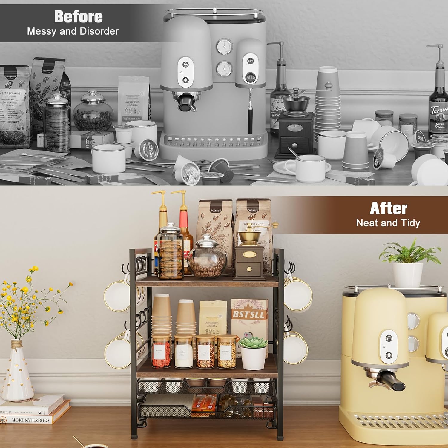 - 【Versatile Coffee Organizer】Coffee bar organizer provides more space for mugs, coffee capsules, tea bags, syrups, and other coffee essentials to keep your coffee station, making your coffee table neater and easier to use