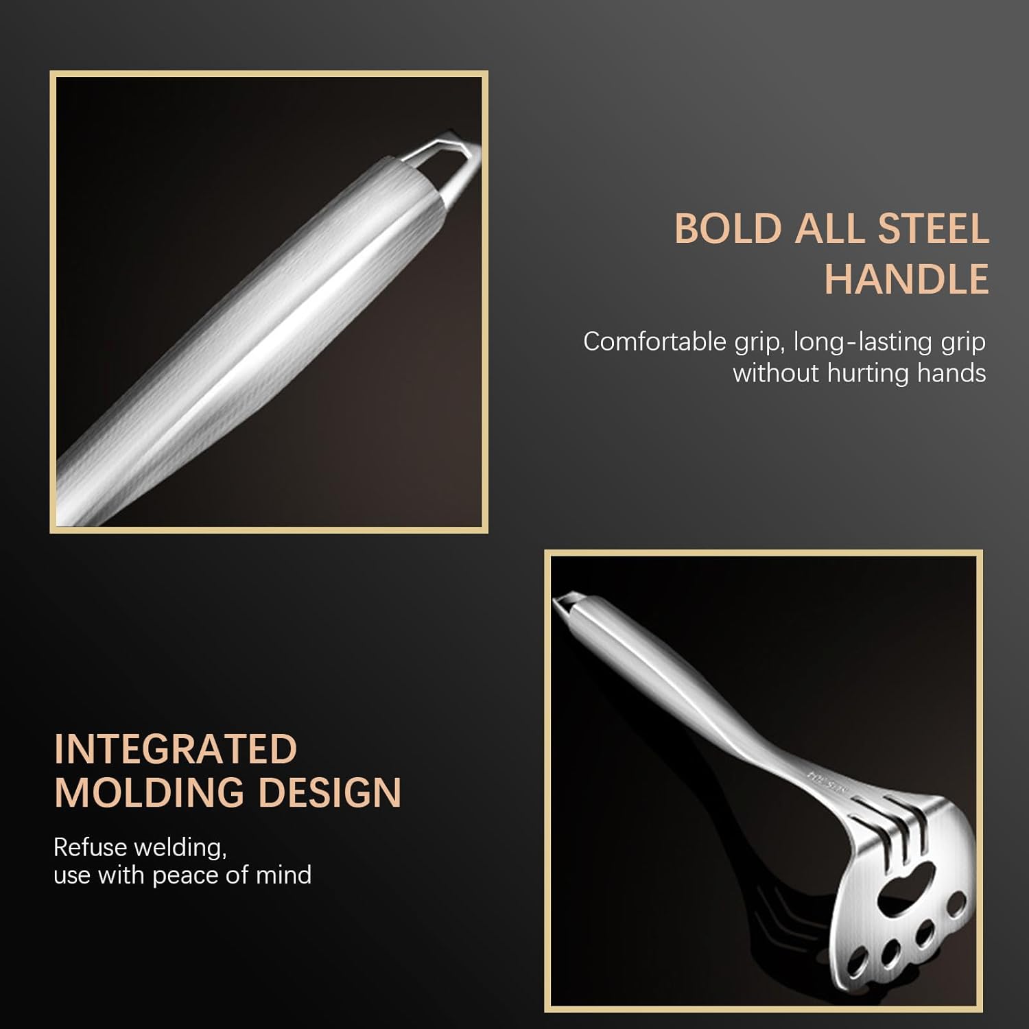 - ✅ Heavy-Duty All-Stainless Steel Construction – This ultra-durable potato masher features a one-piece forged design for maximum strength, resisting rust, bends, and warping even under heavy use. Dishwasher safe.