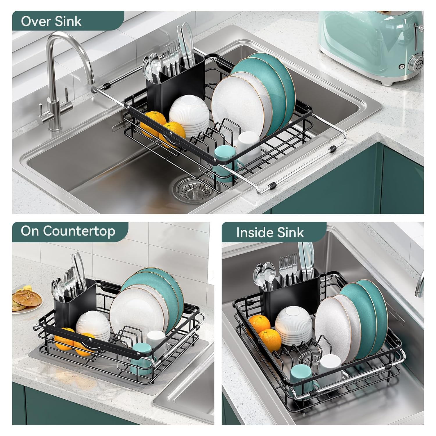 Over the Sink Dish Drying Rack,In Sink Dish Drying Racks,Expandable Dish Rack Over Sink Counter,Adjustable Dish Drainer for Inside Sink with Utensil Holder, Stainless Steel Dish Strainer Large Size