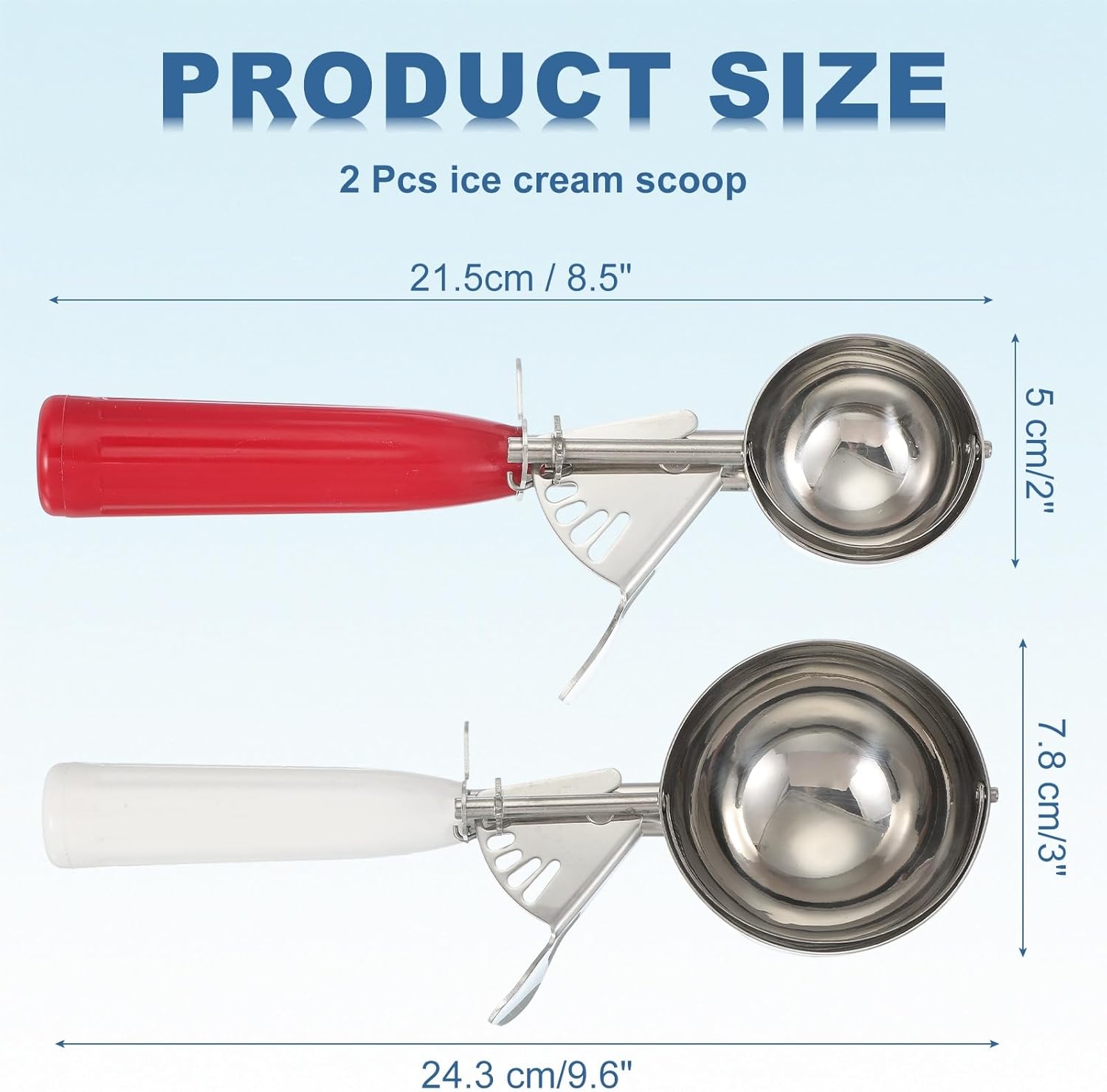 - Package Included - 2 Pcs x ice cream scoop; Length: 21.5 cm/8.5 inch, 24 cm/9.45 inch; Width: 5 cm/2 inch, 8 cm/3.1 inch; Great for housewarming gifts, holiday gifts.
