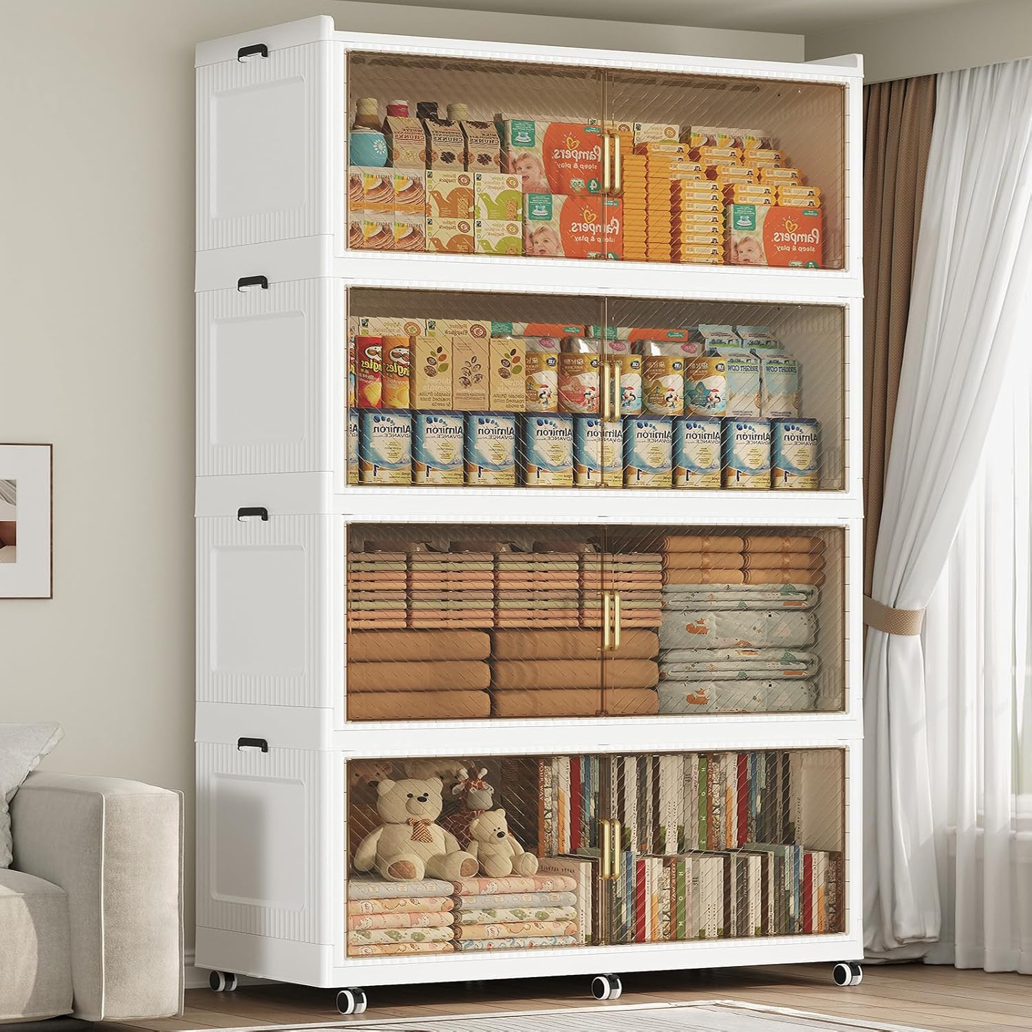 - 【Two Ways to Open & Magnetic Doors】The collapsible storage bins with lids and wheels feature a dual access way, allowing for both top and front door openings, and with clear brown windows for easy visibility. The super huge storage bins with open front doors are equipped with magnetic lock buckles to prevent dust from entering the cabinet.