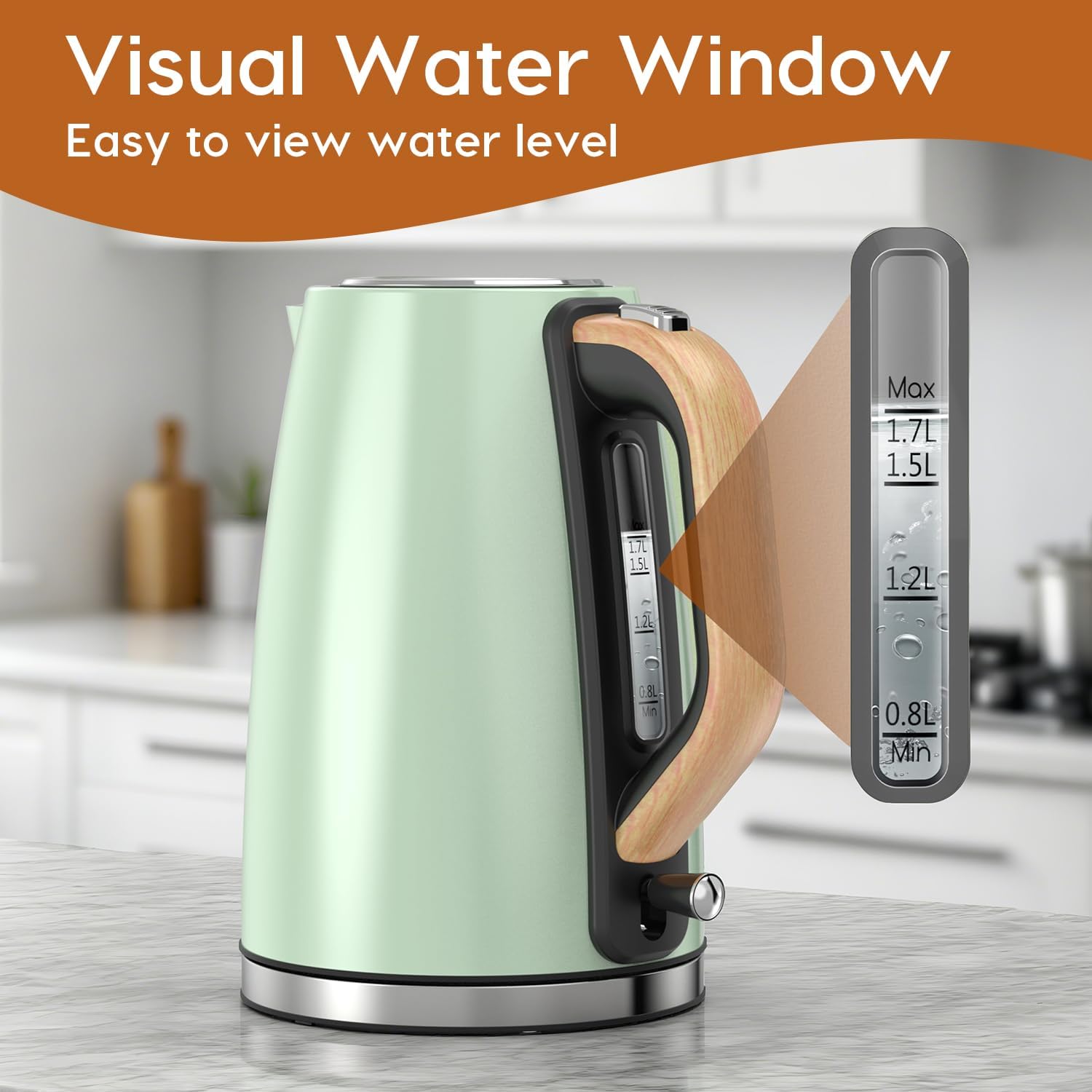 Electric Kettle for Boiling Water, 1.7L Visual Water Window Stainless Steel Electric Water Kettle, 1500W BPA-Free Hot Water Kettle Pot, Auto Shut Off & Boil-Dry Protection, Green