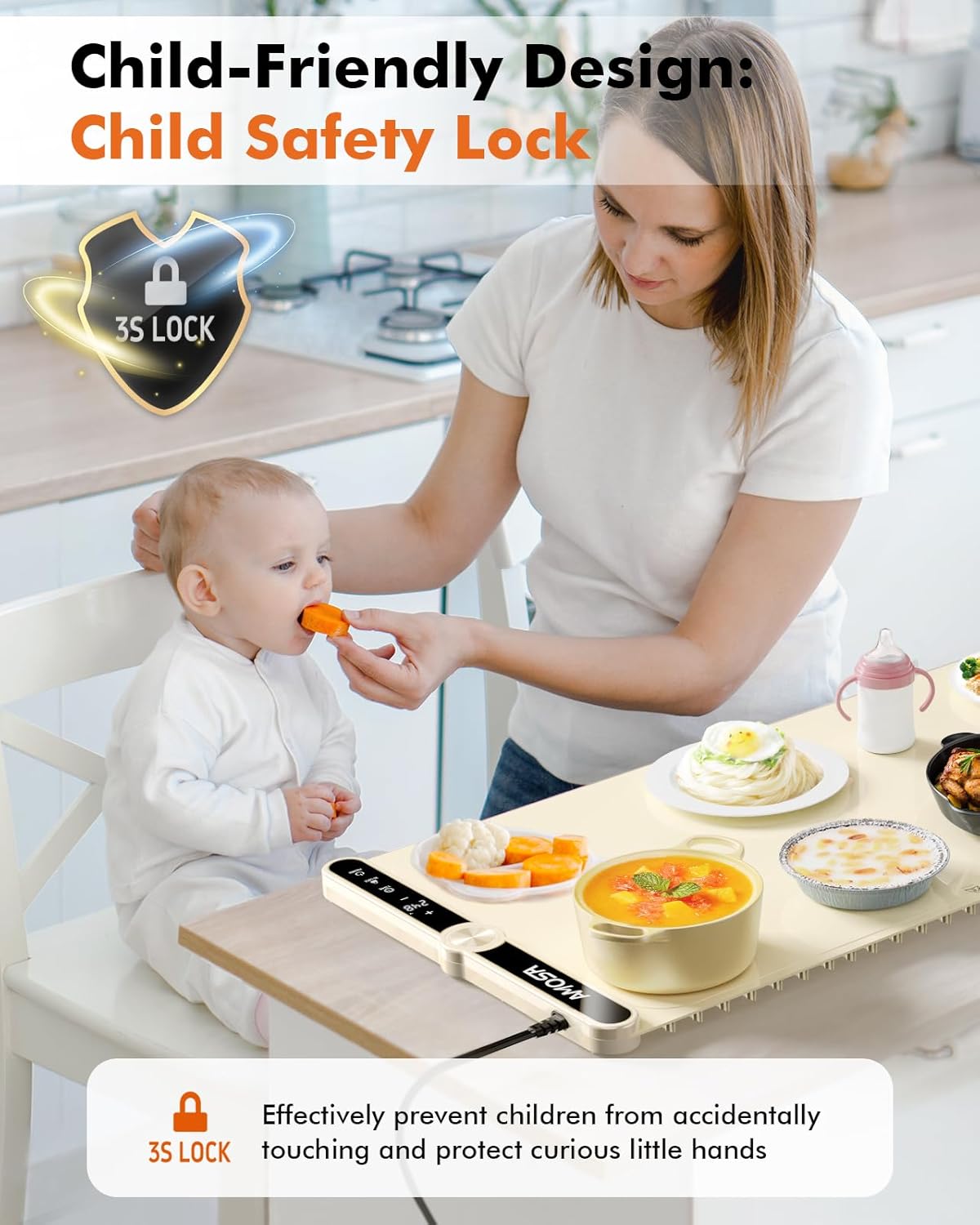 - 【Multiple Safety Protections】Different from other ordinary warming trays, our heating plate has multiple safety protection functions. It will automatically power off after working continuously for 18 hours to prevent accidents. The child protection lock design ensures the safety of your children and reduces accidental injuries caused by accidental touch. The warming pad also has a built-in Over-Temperature Protection to prevent excessive temperature and damage to personnel or machines. In addition, we thoughtfully give you an extra placemat.