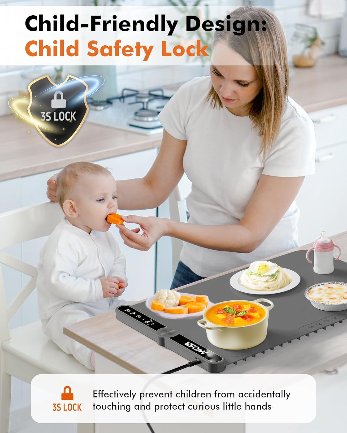 - 【Multiple Safety Protections】Different from other ordinary warming trays, our heating plate has multiple safety protection functions. It will automatically power off after working continuously for 18 hours to prevent accidents. The child protection lock design ensures the safety of your children and reduces accidental injuries caused by accidental touch. The warming pad also has a built-in Over-Temperature Protection to prevent excessive temperature and damage to personnel or machines. In addition, we also thoughtfully give you an extra placemat, which can be placed on your desktop to protect your beloved dining table from being damaged.