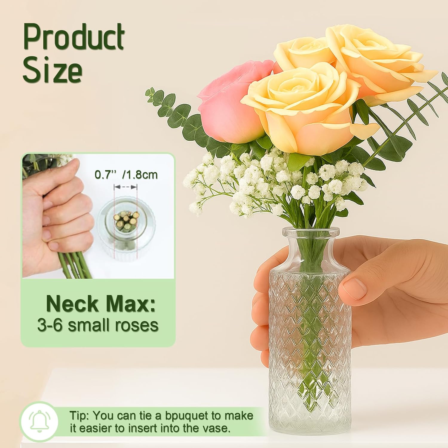 - Thick and Sturdy Glass: These charming small flower vases are made of thick and strong glass, which is durable and not easily broken. These bud vases feature a stable,thickened base and finely textured surfaces that catch the light beautifully, you may see the beauty of individual stems of flowers and garden cuttings vividly from the glass vase.