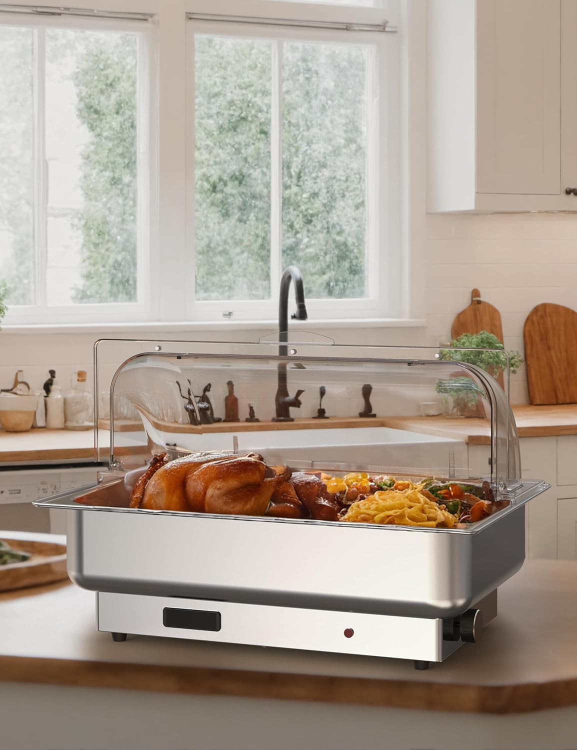 - 【Food Grade Stainless Steel & Roll PC Lid】Warming trays for buffets party is made of food grade stainless steel with a 1/1 NSF-certified food pan. PC lid is made of PC material.