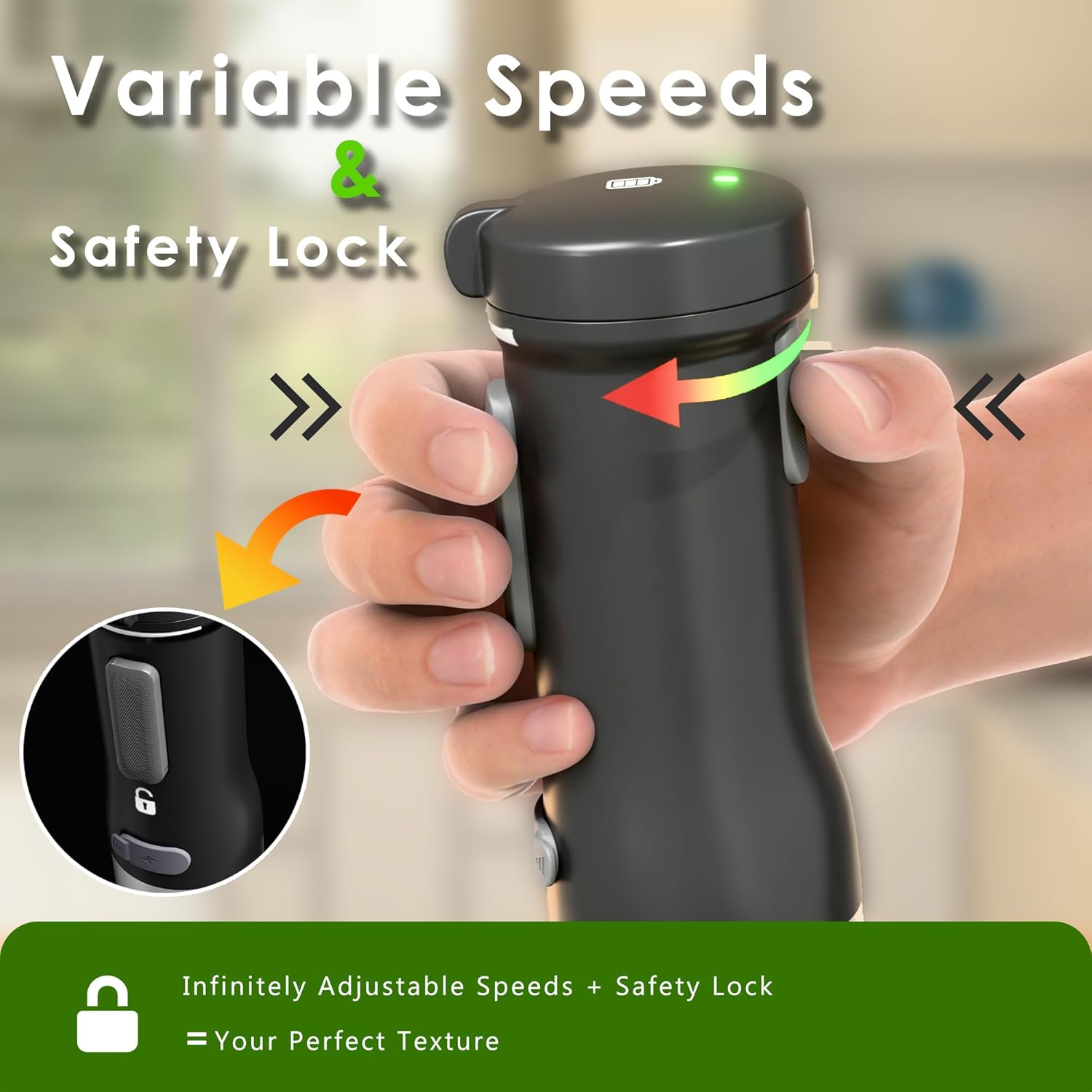 - Multiple Speeds & Sharp Blades for Optimal Performance. The cordless hand blender has 4 sharp, it delivers performance for your blending needs. The blade is equipped with a splash guard, which evenly shreds the food in three dimensions and uses the blade's reaction force for secondary and uniform stirring, while also preventing food from splashing. The hand blender provides precise control for various recipes, allowing you to achieve perfect results.