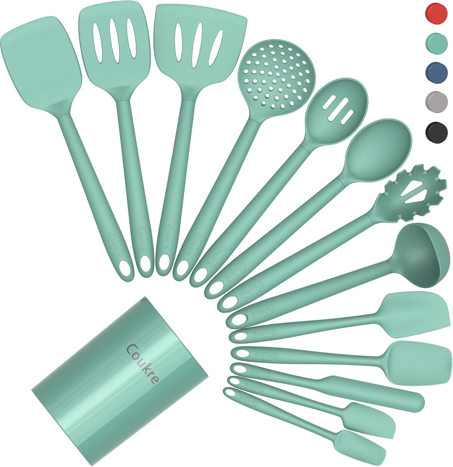 Coukre Silicone Kitchen Cooking Utensils Set with Holder – Heat-Resistant, Food-Grade Kitchen Tools, Spatula, Spoon & Gadgets for Non-Stick Pans, Dishwasher Safe (14, PureAquaGreen)
