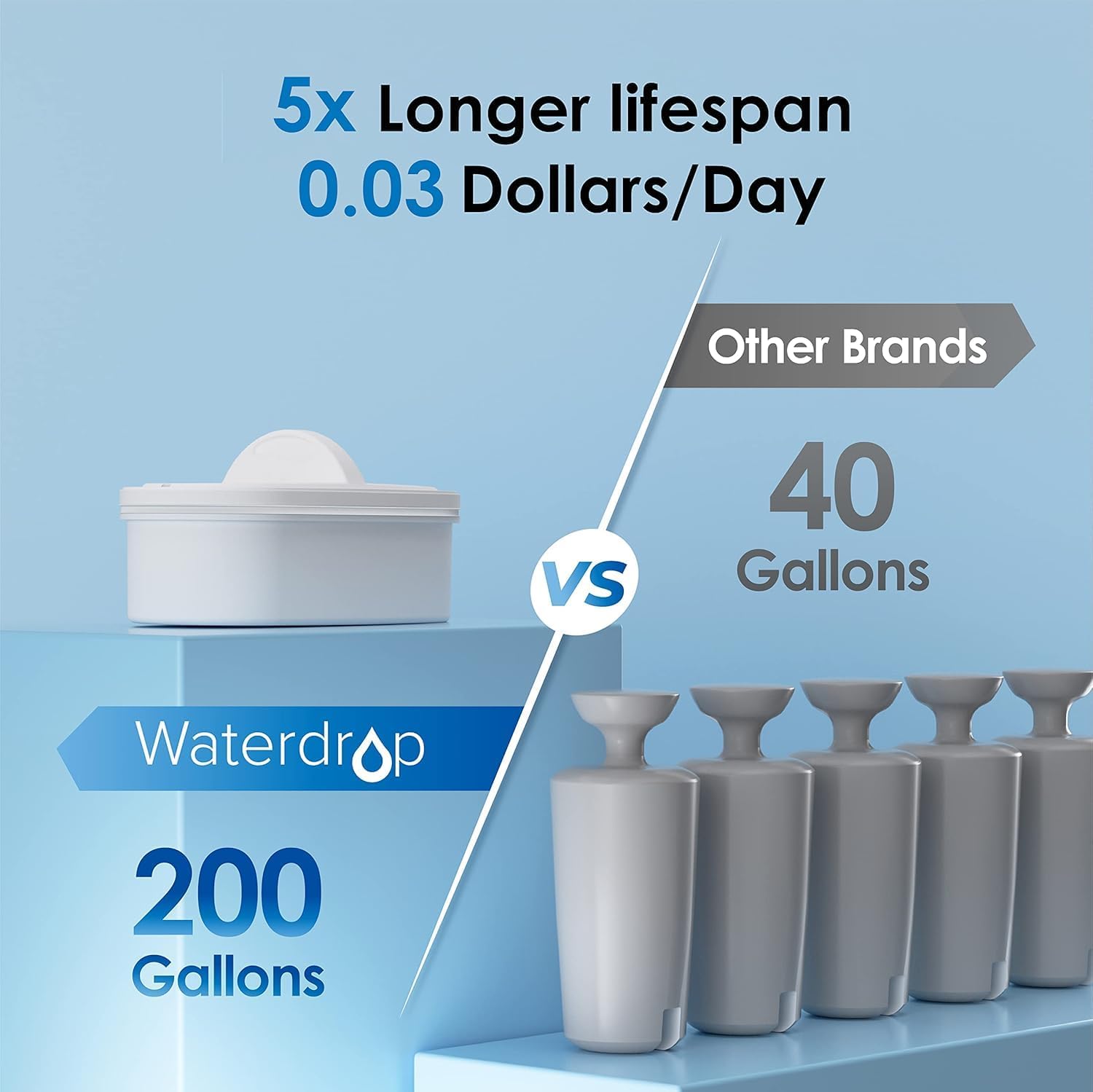 Waterdrop 35-Cup Slim Water Filter Dispenser, Large Capacity Water Filter Pitcher, 200-Gallon Long-Life, 5X Lifetime, Reduces Chlorine, PFOA/PFOS and More, BPA Free, Black (with 3 Filters)