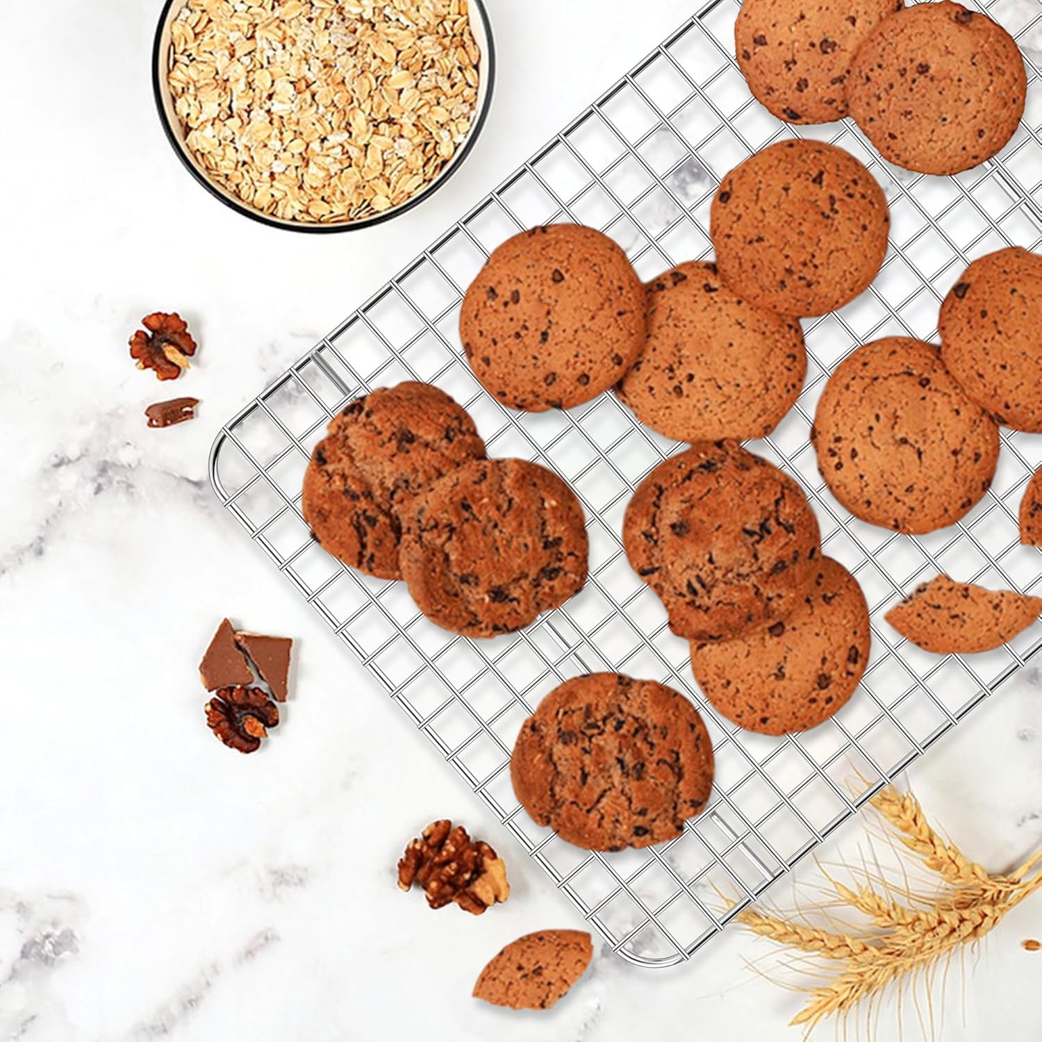 - EXQUISITE CRAFT: Made of thick gauge metal resistant to high temperatures up to 450°F, It is not easy to warp when used in the oven, The flat bottom design makes the cake evenly heated, Grid wire rack has 4 raised legs to raise food from pans or countertop for increased air circulation and cook evenly, Tight grid spacing prevents small items from falling out
