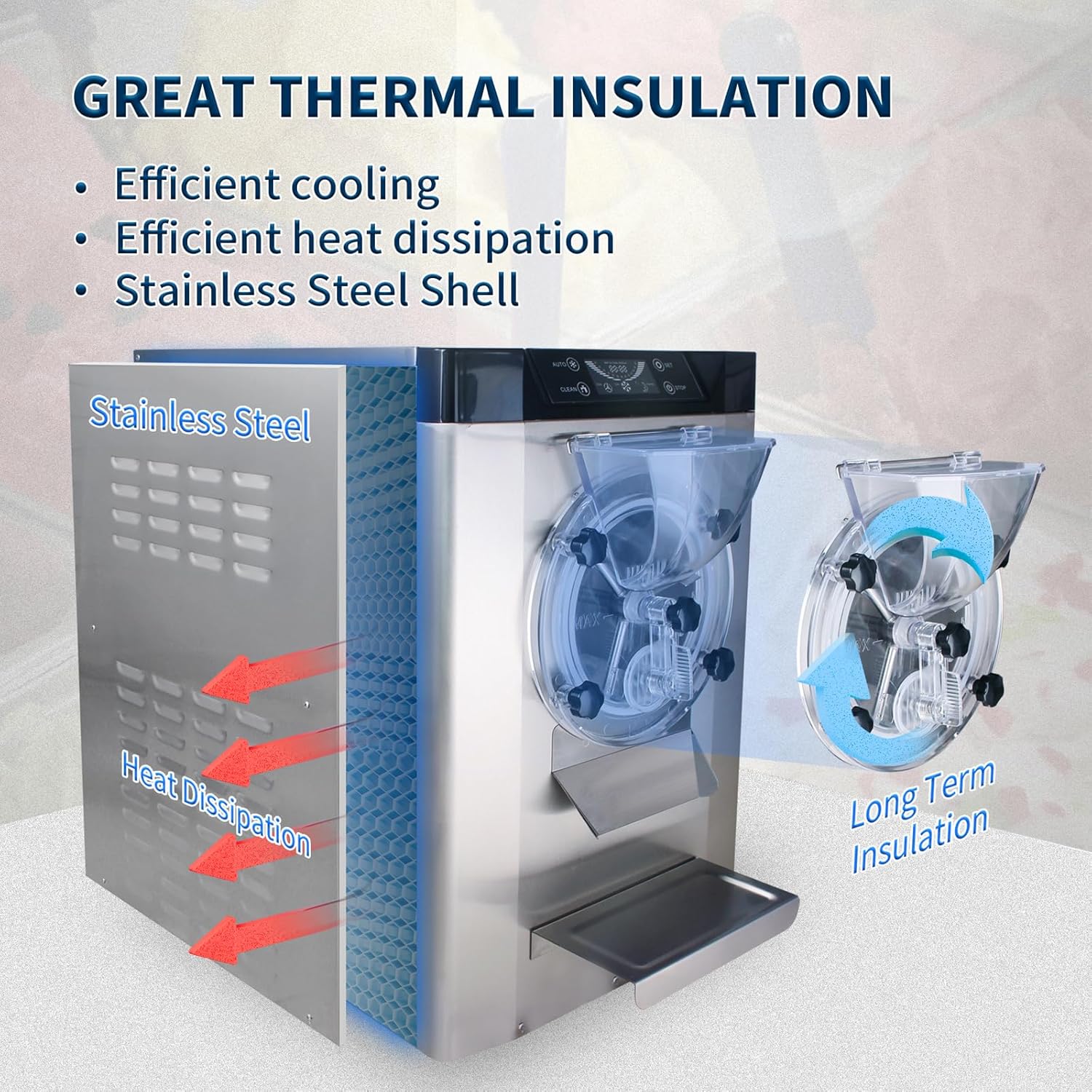 - 【Industrial-Strength Durability】 Reinforced 304 stainless steel housing with corrosion-resistant components. Professional-grade construction features: heavy-duty plastic baffle, anti-vibration rubber feet, copper condenser, high-speed agitator, and R410A eco-refrigerant system certified for commercial food safety.