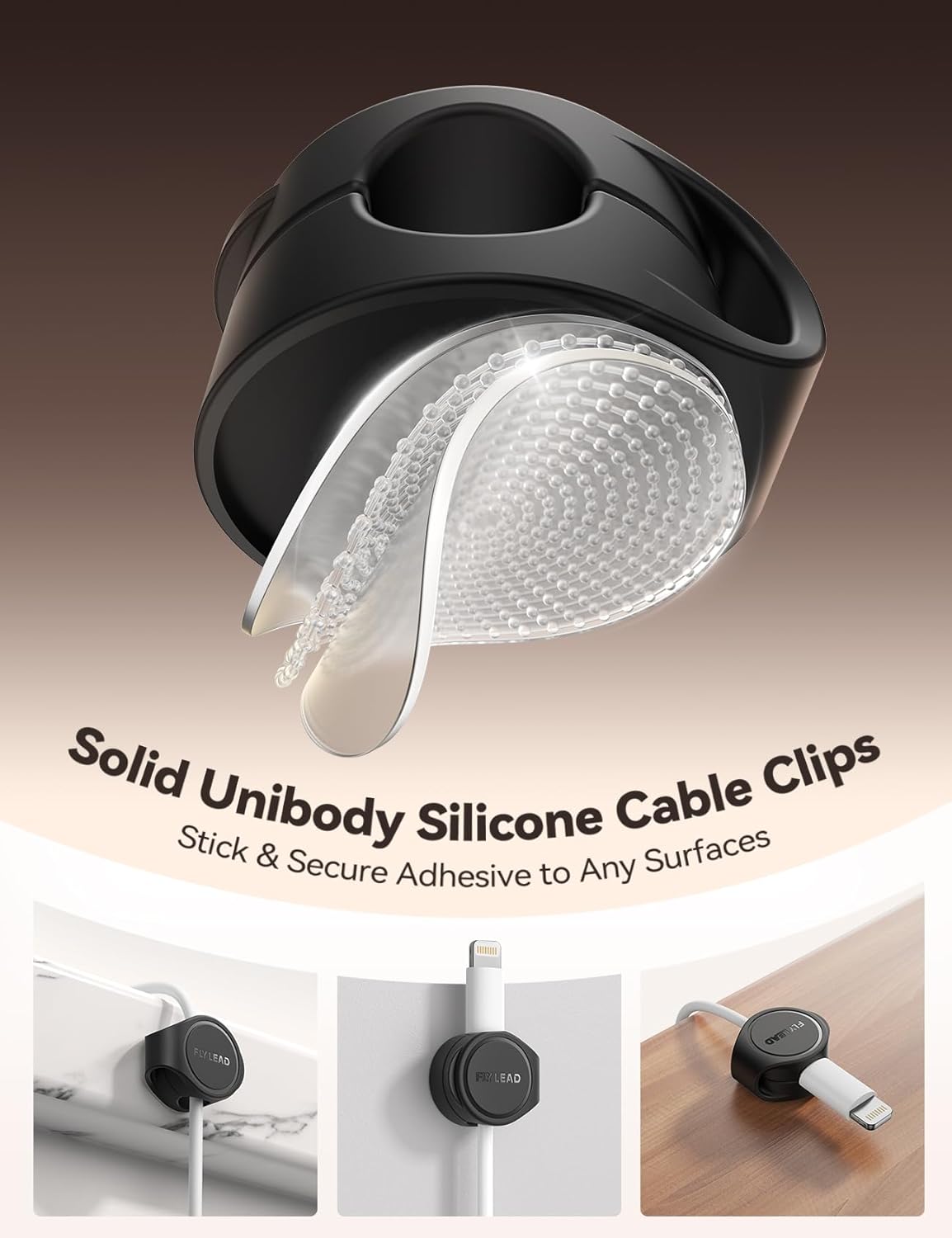 - Special Designed Silicone Magnetic Cable Clips: One-piece silicone molding design FLYLEAD cord organizer with better moldability, the soft silicone material makes this cable organizer more malleable and skin-friendly. After over 10,000 times of tensile tests, the flexible upper and lower joints never broke. With the strongest N55 magnets, covers can be tightly adherent to each other, soft silicone-made FLYLEAD cord holder could embrace cables, which won't squeeze or damage the cables