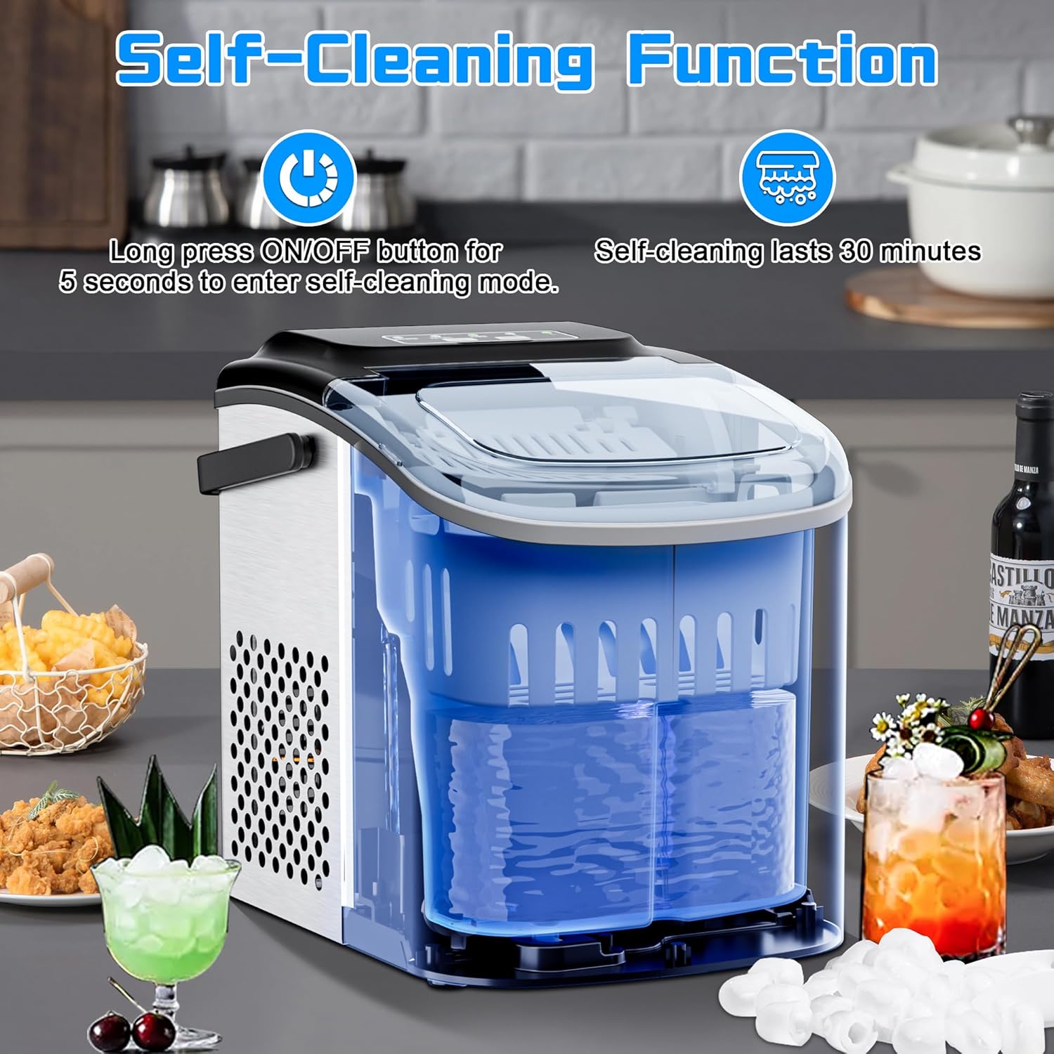 - Self-Cleaning Function: Press and hold the ice maker ‘ON/OFF’ button for 5 seconds to easily start the cleaning cycle, the self-cleaning time will last for 30 minutes, to ensure that the ice production is clean and hygienic, so that you can get fresh, healthy, crystal clear ice at any time.