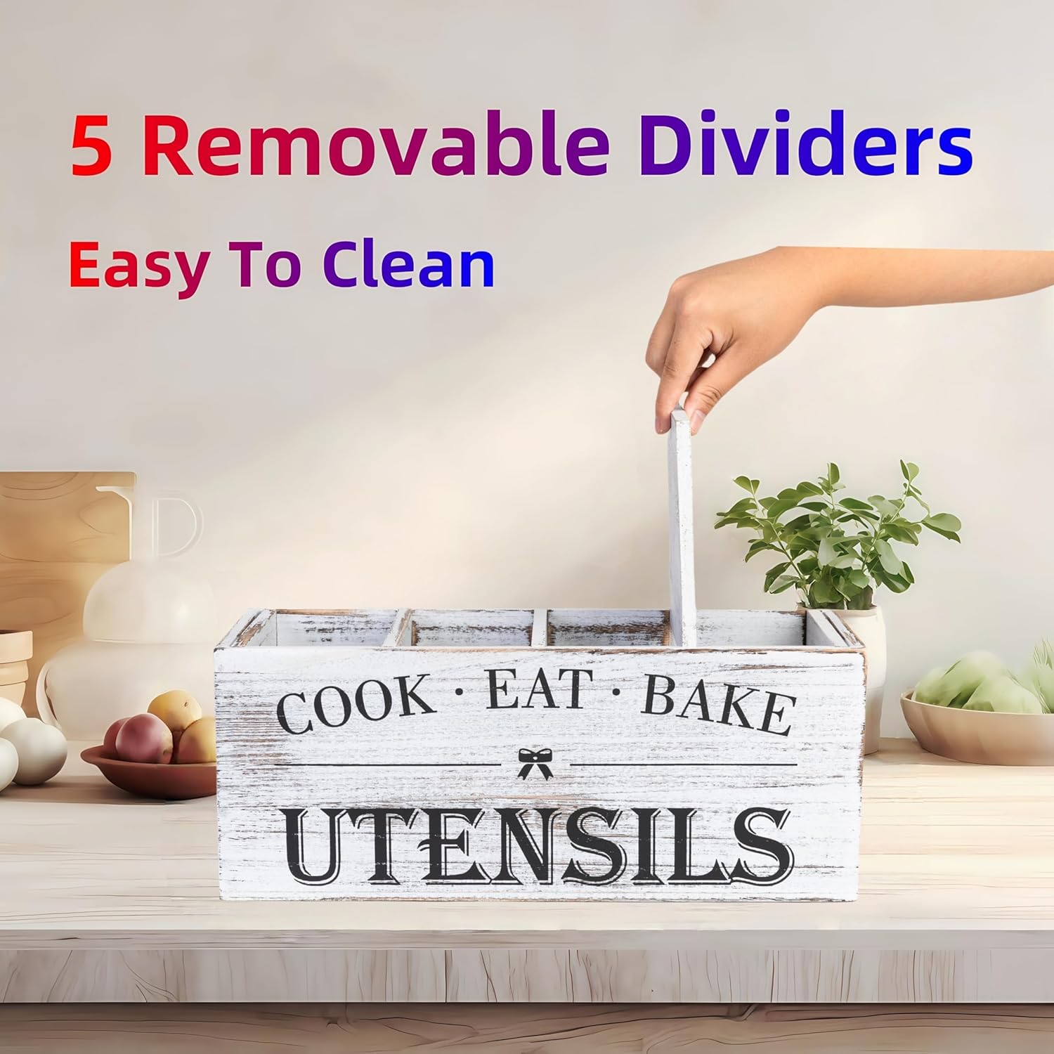 Utensil Holder,Extra Large Wooden Utensil Holder For Kitchen Counter,Cooking Spatula Organizer,Big Storage Caddy With 4 Compartments Flatware Spoon Tool Cutlery(Retro White)