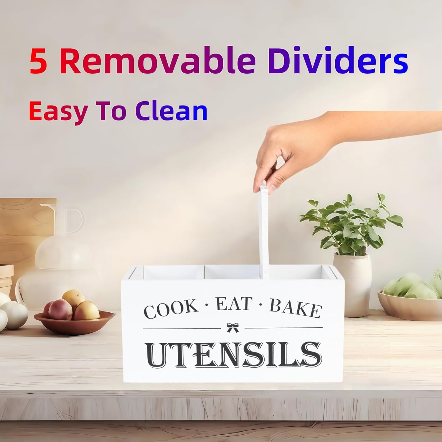 Utensil Holder,Large Wooden Utensil Holder For Kitchen Counter,Cooking Spatula Organizer,Big Storage Caddy With 3 Compartments Flatware Spoon Tool Cutlery(White)