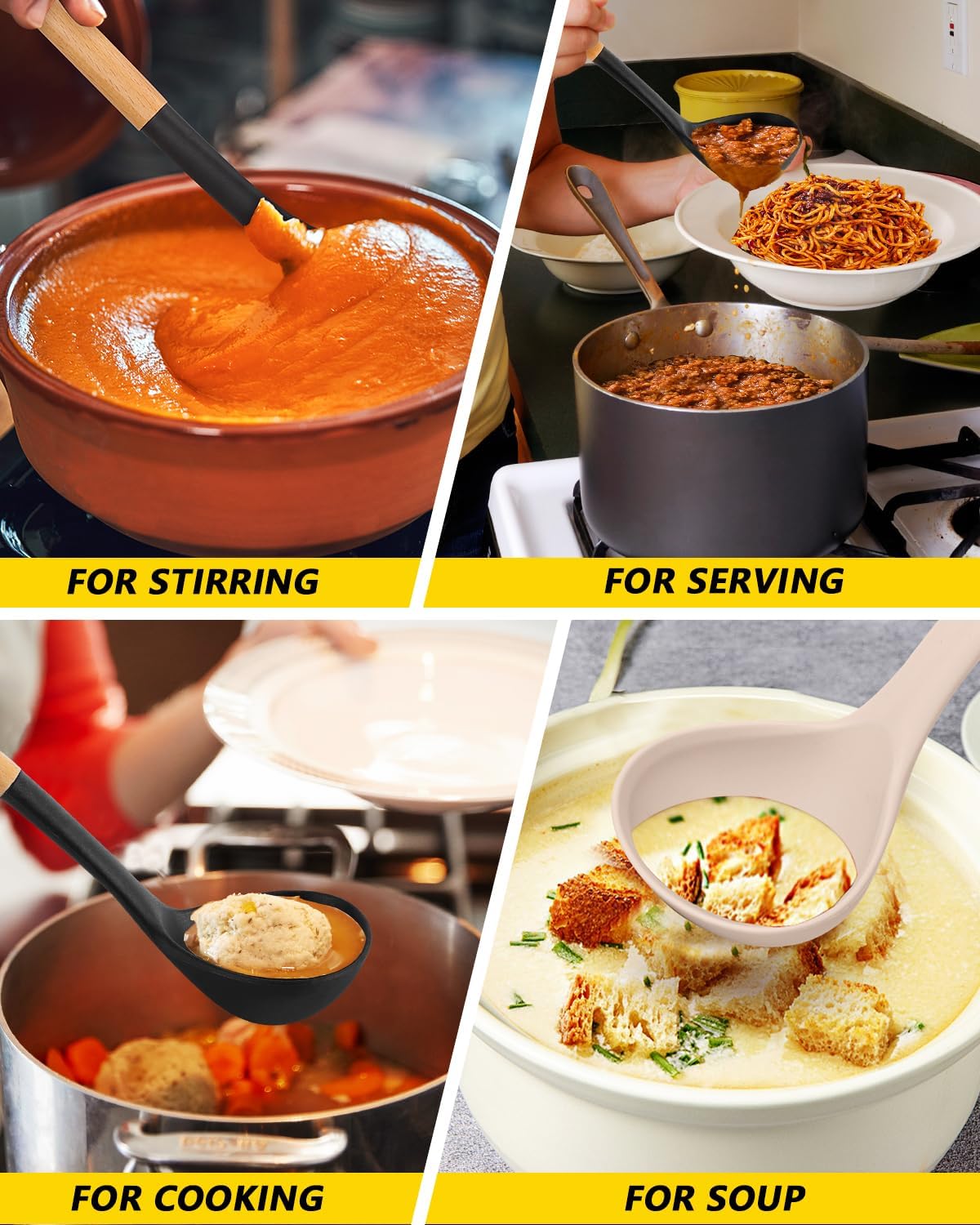 Pack of 2 Soup Ladle, Silicone Ladle Spoon with Wooden Handle, Large Non Stick High Heat Resistant Kitchen Utensils for Cooking, Stirring, Serving Soups(BLACK-KHAKI)