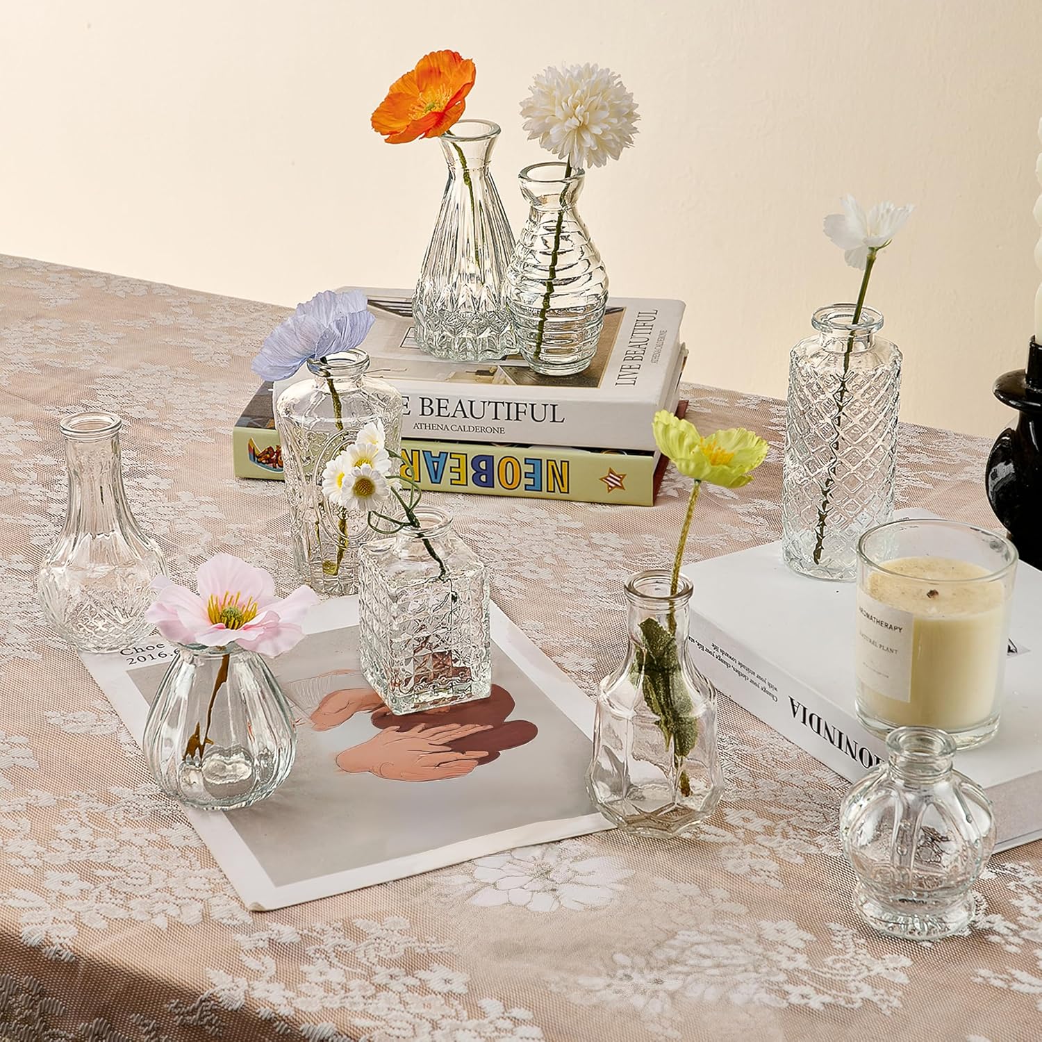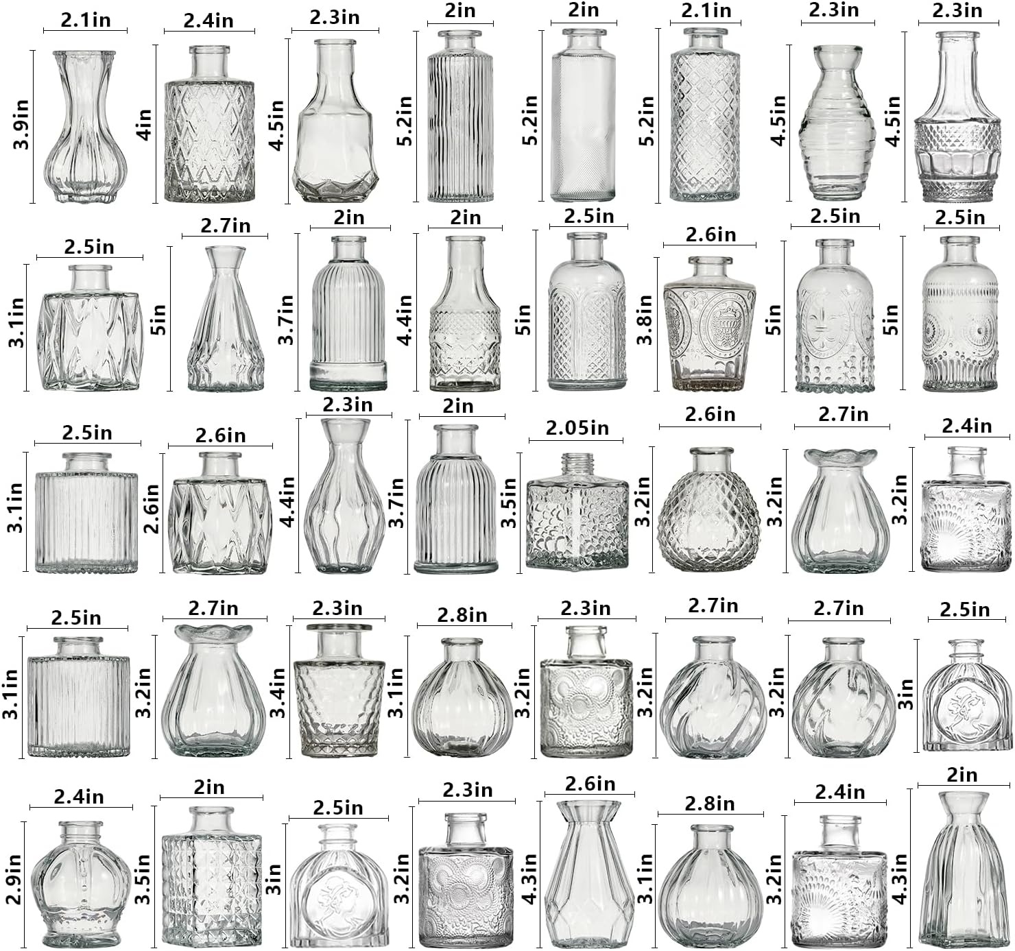 - Versatile Flower Bud Vase Set: This set comprises 40 diverse transparent glass flower bud vases, each adorned with etched designs to further elevate their charm. It is perfectly suited for any home décor. Whether placed as a centerpiece on dining tables, window sills, or wedding banquet tables, these small vintage crystal vases will lend an air of elegance to the setting.
