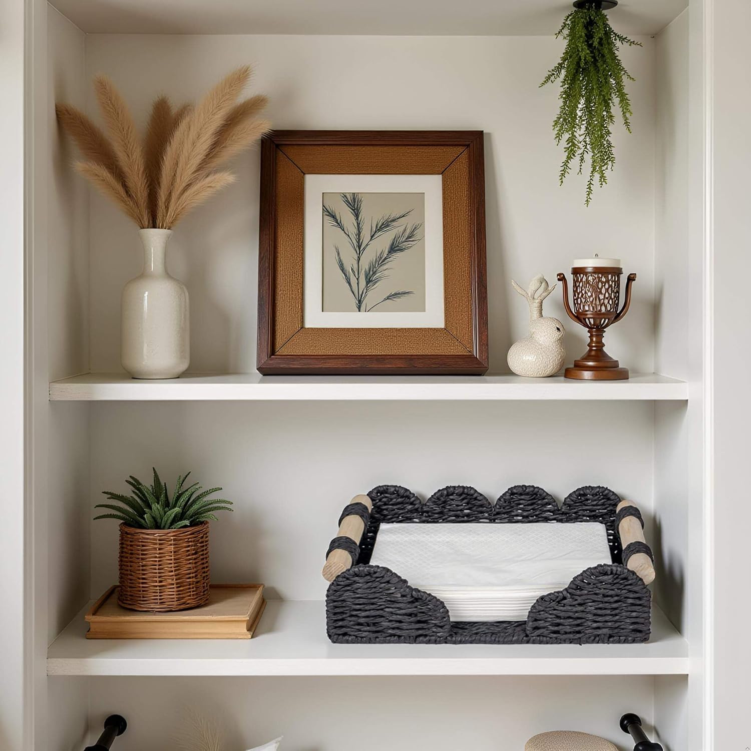 CubesLand Scalloped Napkin Holder for Bathroom Decor, Paper Rope Flat Napkin Dispenser Guest Towel Tray for Bathroom, Farmhouse Warm Napkin Holder for Table Dining Room Home Kitchen Decor, Black