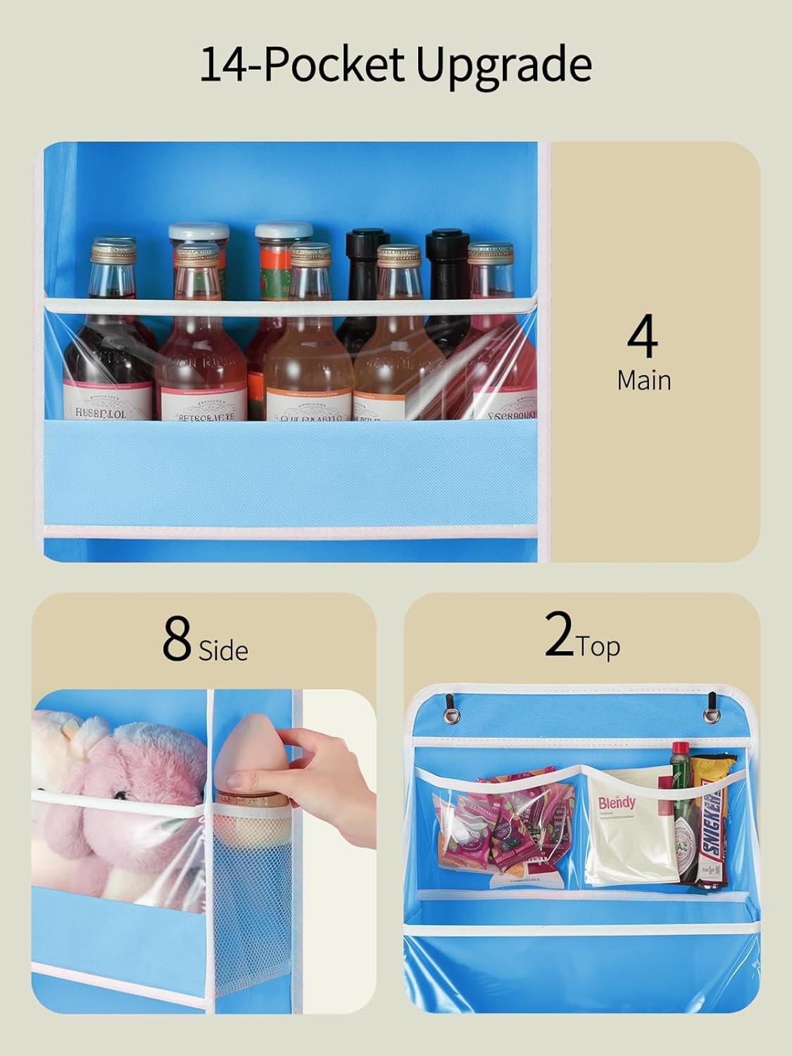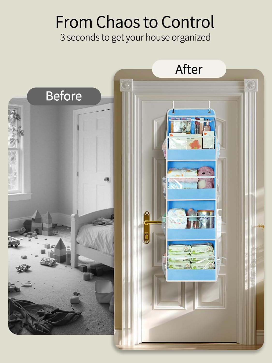 - 4+10 Upgraded Storage Capacity – Featuring 4 spacious compartments, 2 transparent PVC pockets on top, and 8 mesh side pockets, our newly launched over the door organizer offers all-in-one neat storage for everything from bulky household items like clothes, blankets, wipes, and plush toys to small, easily misplaced essentials such as hair ties and Bluetooth earbuds. This latest 5 tier door hanging organizer boasts expanded layers with over double the width and spacing, allowing you to keep everything within easy reach and perfectly organized. 48”(Height) X 18”(Width) X 5.5”(Deep)