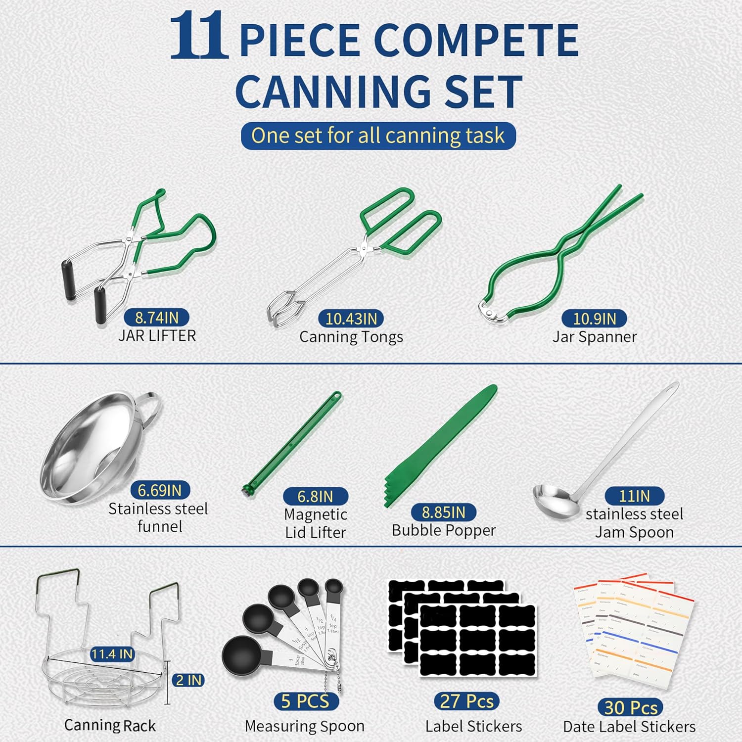 Canning Supplies Starter Kit,Canning Kit for Beginners of 11 with Rack, Jar Lifter,Funnel,Wrench,Tongs,Lid Lifter,Bubble Popper,Labels,ladle,Measuring Spoon-Deep Green