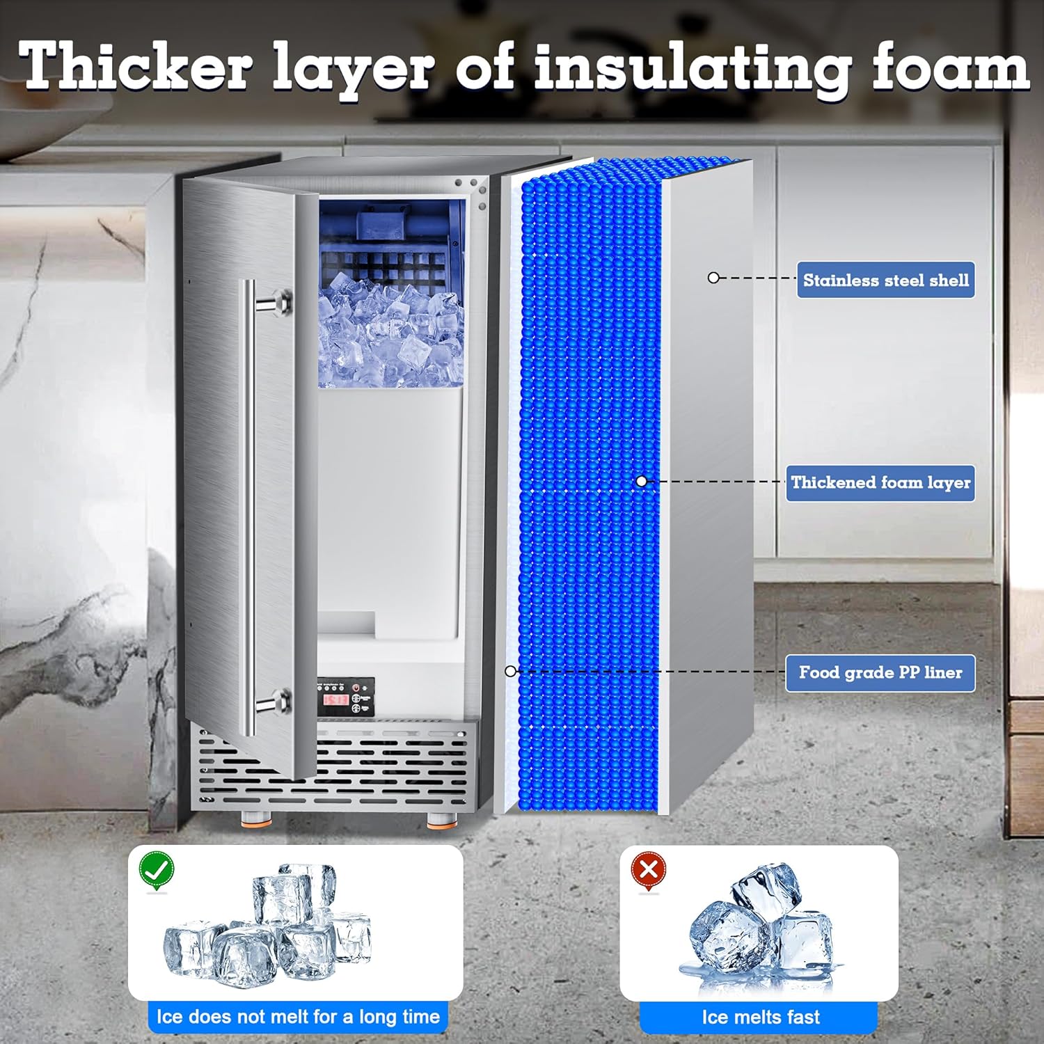 - Self-Cleaning and Stainless Steel Construction: The undercounter ice maker enters the self-cleaning programme by pressing the ‘CLEAN’ button for 5 seconds in standby mode. The high-grade stainless steel shell and thicker foam layer provide excellent thermal insulation, while the food-grade PP liner ensures a clean and hygienic ice-making environment.